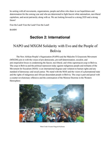 Section 2: International NAPO and MXGM Solidarity with Evo and the People of Bolivia The New Afrikan People’s Organization (NAPO) and the Malcolm X Grassroots Movement (MXGM) join in with the voices of pro-democratic, pro-self-determination, socialist, and anti-imperialist forces in condemning the fascist, neo-liberal, and white supremacist coup in Bolivia. The coup in Bolivia and the political repression today against indigenous people and militants of the Movement for Socialism (MAS) is an international disgrace and violation to human rights and any standard of democracy and social justice. We stand with the MAS and the vision of a plurinational state and the rights of indigenous and African descendant people in Bolivia. The coup is part and parcel with a counter-revolutionary offensive and the continuation of the Monroe Doctrine in the Western Hemisphere.
