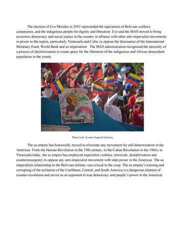 The election of Evo Morales in 2005 represented the aspirations of Bolivian workers, campesinos, and the indigenous people for dignity and liberation. Evo and the MAS moved to bring economic democracy and social justice in the country in alliance with other anti-imperialist movements in power in the region, particularly Venezuela and Cuba, to oppose the dominance of the International Monetary Fund, World Bank and us imperialism. The MAS administration recognized the necessity of a process of decolonization to create space for the liberation of the indigenous and African descendant population in the county.