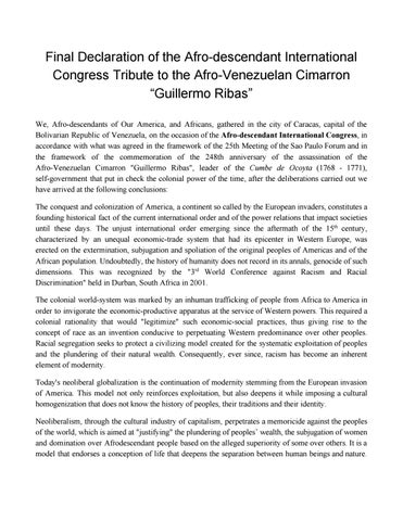 Final Declaration of the Afro-descendant International Congress Tribute to the Afro-Venezuelan Cimarron “Guillermo Ribas” We, Afro-descendants of Our America, and Africans, gathered in the city of Caracas, capital of the Bolivarian Republic of Venezuela, on the occasion of the Afro-descendant International Congress, in accordance with what was agreed in the framework of the 25th Meeting of the Sao Paulo Forum and in the framework of the commemoration of the 248th anniversary of the assassination of the Afro-Venezuelan Cimarron "Guillermo Ribas", leader of the Cumbe de Ocoyta (1768 - 1771), self-government that put in check the colonial power of the time, after the deliberations carried out we have arrived at the following conclusions: The conquest and colonization of America, a continent so called by the European invaders, constitutes a founding historical fact of the current international order and of the power relations that impact societies until these days. The unjust international order emerging since the aftermath of the 15th century, characterized by an unequal economic-trade system that had its epicenter in Western Europe, was erected on the extermination, subjugation and spoliation of the original peoples of Americas and of the African population. Undoubtedly, the history of humanity does not record in its annals, genocide of such dimensions. This was recognized by the "3rd World Conference against Racism and Racial Discrimination" held in Durban, South Africa in 2001. The colonial world-system was marked by an inhuman trafficking of people from Africa to America in order to invigorate the economic-productive apparatus at the service of Western powers. This required a colonial rationality that would "legitimize" such economic-social practices, thus giving rise to the concept of race as an invention conducive to perpetuating Western predominance over other peoples. Racial segregation seeks to protect a civilizing model created for the systematic exploitation of peoples and the plundering of their natural wealth. Consequently, ever since, racism has become an inherent element of modernity. Today's neoliberal globalization is the continuation of modernity stemming from the European invasion of America. This model not only reinforces exploitation, but also deepens it while imposing a cultural homogenization that does not know the history of peoples, their traditions and their identity. Neoliberalism, through the cultural industry of capitalism, perpetrates a memoricide against the peoples of the world, which is aimed at "justifying" the plundering of peoples’ wealth, the subjugation of women and domination over Afrodescendant people based on the alleged superiority of some over others. It is a model that endorses a conception of life that deepens the separation between human beings and nature.