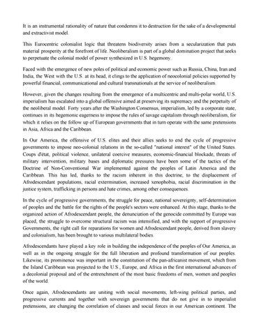 It is an instrumental rationality of nature that condemns it to destruction for the sake of a developmental and extractivist model. This Eurocentric colonialist logic that threatens biodiversity arises from a secularization that puts material prosperity at the forefront of life. Neoliberalism is part of a global domination project that seeks to perpetuate the colonial model of power synthesized in U.S. hegemony. Faced with the emergence of new poles of political and economic power such as Russia, China, Iran and India, the West with the U.S. at its head, it clings to the application of neocolonial policies supported by powerful financial, communicational and cultural transnationals at the service of neoliberalism. However, given the changes resulting from the emergence of a multicentric and multi-polar world, U.S. imperialism has escalated into a global offensive aimed at preserving its supremacy and the perpetuity of the neoliberal model. Forty years after the Washington Consensus, imperialism, led by a corporate state, continues in its hegemonic eagerness to impose the rules of savage capitalism through neoliberalism, for which it relies on the follow up of European governments that in turn operate with the same pretensions in Asia, Africa and the Caribbean. In Our America, the offensive of U.S. elites and their allies seeks to end the cycle of progressive governments to impose neo-colonial relations in the so-called "national interest" of the United States. Coups d'ĂŠtat, political violence, unilateral coercive measures, economic-financial blockade, threats of military intervention, military bases and diplomatic pressures have been some of the tactics of the Doctrine of Non-Conventional War implemented against the peoples of Latin America and the Caribbean. This has led, thanks to the racism inherent in this doctrine, to the displacement of Afrodescendant populations, racial extermination, increased xenophobia, racial discrimination in the justice system, trafficking in persons and hate crimes, among other consequences. In the cycle of progressive governments, the struggle for peace, national sovereignty, self-determination of peoples and the battle for the rights of the people's sectors were enhanced. At this stage, thanks to the organized action of Afrodescendant people, the denunciation of the genocide committed by Europe was placed, the struggle to overcome structural racism was intensified, and with the support of progressive Governments, the right call for reparations for women and Afrodescendant people, derived from slavery and colonialism, has been brought to various multilateral bodies. Afrodescendants have played a key role in building the independence of the peoples of Our America, as well as in the ongoing struggle for the full liberation and profound transformation of our peoples. Likewise, its prominence was important in the constitution of the pan-africanist movement, which from the Island Caribbean was projected to the U.S., Europe, and Africa in the first international advances of a decolonial proposal and of the entrenchment of the most basic freedoms of men, women and peoples of the world. Once again, Afrodescendants are uniting with social movements, left-wing political parties, and progressive currents and together with sovereign governments that do not give in to imperialist pretensions, are changing the correlation of classes and social forces in our American continent. The