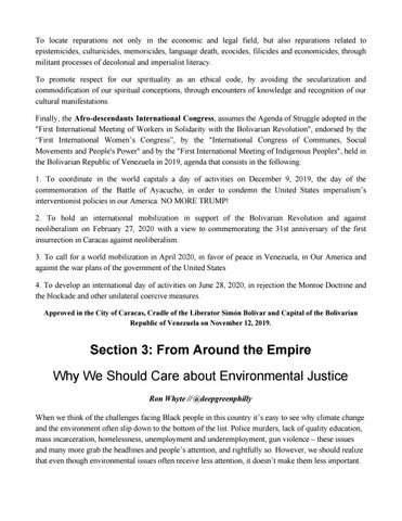 To locate reparations not only in the economic and legal field, but also reparations related to epistemicides, culturicides, memoricides, language death, ecocides, filicides and economicides, through militant processes of decolonial and imperialist literacy. To promote respect for our spirituality as an ethical code, by avoiding the secularization and commodification of our spiritual conceptions, through encounters of knowledge and recognition of our cultural manifestations. Finally, the Afro-descendants International Congress, assumes the Agenda of Struggle adopted in the "First International Meeting of Workers in Solidarity with the Bolivarian Revolution", endorsed by the “First International Women’s Congress”, by the "International Congress of Communes, Social Movements and People's Power" and by the "First International Meeting of Indigenous Peoples", held in the Bolivarian Republic of Venezuela in 2019, agenda that consists in the following: 1. To coordinate in the world capitals a day of activities on December 9, 2019, the day of the commemoration of the Battle of Ayacucho, in order to condemn the United States imperialism’s interventionist policies in our America. NO MORE TRUMP! 2. To hold an international mobilization in support of the Bolivarian Revolution and against neoliberalism on February 27, 2020 with a view to commemorating the 31st anniversary of the first insurrection in Caracas against neoliberalism. 3. To call for a world mobilization in April 2020, in favor of peace in Venezuela, in Our America and against the war plans of the government of the United States 4. To develop an international day of activities on June 28, 2020, in rejection the Monroe Doctrine and the blockade and other unilateral coercive measures. Approved in the City of Caracas, Cradle of the Liberator Simón Bolívar and Capital of the Bolivarian Republic of Venezuela on November 12, 2019.