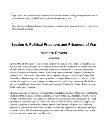 Section 4: Political Prisoners and Prisoners of War Veronza Bowers Nyeusi Jami Veronza “Daoud” Bowers is 74 years old and currently held captive at the Federal Medical Prison in Butner, North Carolina. He grew up in Omaha, Nebraska where he joined the Black Panther Party and became known as a very effective community organizer. He later moved to California and became Captain of the Party’s Richmond branch. Like so many others, he became a target of CoIntelPro. In September 1973, when he was 28 years old with a 5-year-old daughter, a small army of troops from various law enforcement agencies came to arrest him on charges related to robbery. However, in that instance, the empire’s troops were sloppy and those state charges had to get thrown out. But the Feds swooped in and charged Veronza with first degree murder of a National Park Service Ranger to ensure that he would stay in captivity. Veronza was given a life sentence, which according to the federal guidelines of that time, meant that he would serve thirty years and then have a mandatory “supervised release,” the federal version of parole. On April 7, 2004 the thirty years had arrived and Veronza’s friends and family from around the world were ready to receive him upon his release. This time, the National Parole Commission stepped in to keep him in captivity at the insistence of the Fraternal Order of Police. His parole was supposedly postponed in order to allow the victims’ relatives to express their opposition at a new parole hearing in December 2005 in which his mandatory p arole was denied. His parole has been continuously denied since then, the most recent time being May 2019.