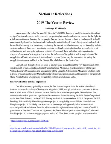 Section 1: Reflections 2019 The Year in Review Makungu M. Akinyela As we reach the end of the year 2019 the staff of BAMN thought it would be important to reflect on significant developments and events over the past twelve months and what they mean for the fight for self-determination and freedom for our people. We are excited that our collective has been able to build a consistent rhythm of publication which has brought us to this fourth issue of the journal, and we look forward in the coming year to not only continuing the journal but also to improving on its quality in both contents and reach. We expect to not only continue on this electronic platform but to broaden to print publication as well as regular video and podcasts. Combined, these will allow us to report on the progress of our people’s struggle and to widen the influence of the political and strategic ideas of the struggle for self-determination and political and economic democracy for our nation, including the struggle for autonomy and land in the historic black belt here in the South-East. As we begin this reflection, we want to acknowledge a great loss at the very beginning of 2019 with the death of our comrade and sister Mama Nehanda Abiodun, a founding member of the New Afrikan People’s Organization and an organizer of the Malcolm X Grassroots Movement while in exile in Cuba. We continue to honor Mama Nehanda’s legacy and commitment and to remember her comrade Mama Assata Shakur who remains protected in exile in revolutionary Cuba. 400 years of settler-colonial oppression 2019 has been recognized by some as the four hundredth year since the arrival of enslaved Africans in the settler colony of Jamestown, Virginia in 1619, though both free and enslaved Africans were in other areas of North America such as Florida for at least 100 years prior. Nevertheless, this 1 remembered date has generated significant discussion and debate including the 1619 Project organized by the New York Times to “reframe” U.S. history so that it is understood that 1619 is the year of the U.S. founding. This decidedly liberal integrationist project is being led by author Nikole Hannah-Jones. Though the project is decidedly pro-American in its concept and approach, it has been met with expected pushback and debate from the white nationalist right which currently has control of the U.S. 2 government at this time. They are led by people like former House Speaker Newt Gingrich, who said that this project is “brainwashing propaganda and a lie”. This focus on our people’s enslavement has 1