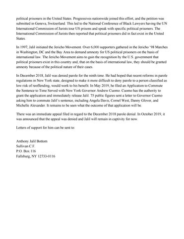 political prisoners in the United States. Progressives nationwide joined this effort, and the petition was submitted in Geneva, Switzerland. This led to the National Conference of Black Lawyers having the UN International Commission of Jurists tour US prisons and speak with specific political prisoners. The International Commission of Jurists then reported that political prisoners did in fact exist in the United States. In 1997, Jalil initiated the Jericho Movement. Over 6,000 supporters gathered in the Jericho ‘98 Marches in Washington, DC and the Bay Area to demand amnesty for US political prisoners on the basis of international law. The Jericho Movement aims to gain the recognition by the U.S. government that political prisoners exist in this country and, that on the basis of international law, they should be granted amnesty because of the political nature of their cases. In December 2018, Jalil was denied parole for the ninth time. He had hoped that recent reforms in parole regulations in New York state, designed to make it more difficult to deny parole to a person classified as low risk of reoffending, would work to his benefit. In May 2019, he filed an Application to Commute the Sentence to Time Served with New York Governor Andrew Cuomo. Cuomo has the authority to grant the application and immediately release Jalil. 75 public figures sent a letter to Governor Cuomo asking him to commute Jalil’s sentence, including Angela Davis, Cornel West, Danny Glover, and Michelle Alexander. It remains to be seen what the outcome of that application will be. There was an immediate appeal filed in regard to the December 2018 parole denial. In October 2019, it was announced that the appeal was denied and Jalil will remain in captivity for now. Letters of support for him can be sent to: