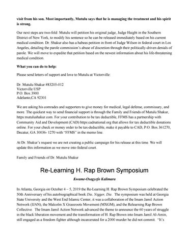 visit from his son. Most importantly, Mutulu says that he is managing the treatment and his spirit is strong. Our next steps are two-fold: Mutulu will petition his original judge, Judge Haight in the Southern District of New York, to modify his sentence so he can be released immediately based on his current medical condition. Dr. Shakur also has a habeas petition in front of Judge Wilson in federal court in Los Angeles, detailing the parole commission’s abuse of discretion through their politically-driven denials of parole. We will move to expedite that petition based on the newest information about his life-threatening medical condition. What you can do to help: Please send letters of support and love to Mutulu at Victorville: Dr. Mutulu Shakur #83205-012 Victorville USP P.O. Box 3900 Adelanto,CA 92301 We are asking his comrades and supporters to give money for medical, legal defense, commissary, and more. The quickest way to send financial support is through the Family and Friends of Mutulu Shakur, https:mutulushakur.com. For your contribution to be tax deductible, FFMS has a partnership with Community Aid and Development (CAD) https:cadnational.org that allows for tax deductible donations online. For your check or money order to be tax-deductible, make it payable to CAD, P.O. Box 361270, Decatur, GA 30036- 1270 with “FFMS” in the memo line. At Dr. Shakur’s request we are not creating a public campaign for his release at this time. We will update this information as we move into federal court. Family and Friends of Dr. Mutulu Shakur