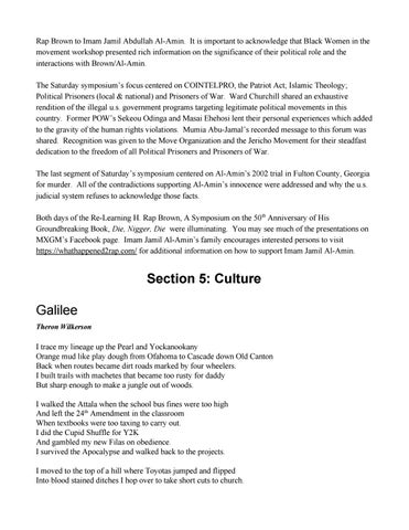 Rap Brown to Imam Jamil Abdullah Al-Amin. It is important to acknowledge that Black Women in the movement workshop presented rich information on the significance of their political role and the interactions with Brown/Al-Amin. The Saturday symposium’s focus centered on COINTELPRO, the Patriot Act; Islamic Theology; Political Prisoners (local & national) and Prisoners of War. Ward Churchill shared an exhaustive rendition of the illegal u.s. government programs targeting legitimate political movements in this country. Former POW’s Sekeou Odinga and Masai Ehehosi lent their personal experiences which added to the gravity of the human rights violations. Mumia Abu-Jamal’s recorded message to this forum was shared. Recognition was given to the Move Organization and the Jericho Movement for their steadfast dedication to the freedom of all Political Prisoners and Prisoners of War. The last segment of Saturday’s symposium centered on Al-Amin’s 2002 trial in Fulton County, Georgia for murder. All of the contradictions supporting Al-Amin’s innocence were addressed and why the u.s. judicial system refuses to acknowledge those facts. Both days of the Re-Learning H. Rap Brown, A Symposium on the 50th Anniversary of His Groundbreaking Book, Die, Nigger, Die were illuminating. You may see much of the presentations on MXGM’s Facebook page. Imam Jamil Al-Amin’s family encourages interested persons to visit https://whathappened2rap.com/ for additional information on how to support Imam Jamil Al-Amin.