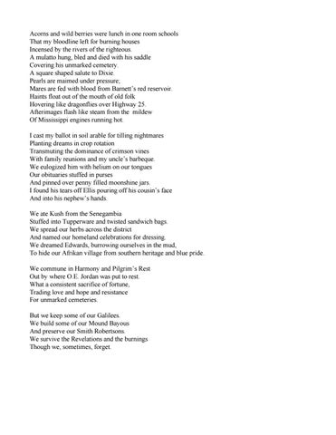 Acorns and wild berries were lunch in one room schools That my bloodline left for burning houses Incensed by the rivers of the righteous. A mulatto hung, bled and died with his saddle Covering his unmarked cemetery. A square shaped salute to Dixie. Pearls are maimed under pressure; Mares are fed with blood from Barnett’s red reservoir. Haints float out of the mouth of old folk Hovering like dragonflies over Highway 25. Afterimages flash like steam from the mildew Of Mississippi engines running hot. I cast my ballot in soil arable for tilling nightmares Planting dreams in crop rotation Transmuting the dominance of crimson vines With family reunions and my uncle’s barbeque. We eulogized him with helium on our tongues Our obituaries stuffed in purses And pinned over penny filled moonshine jars. I found his tears off Ellis pouring off his cousin’s face And into his nephew’s hands. We ate Kush from the Senegambia Stuffed into Tupperware and twisted sandwich bags. We spread our herbs across the district And named our homeland celebrations for dressing. We dreamed Edwards, burrowing ourselves in the mud, To hide our Afrikan village from southern heritage and blue pride. We commune in Harmony and Pilgrim’s Rest Out by where O.E. Jordan was put to rest. What a consistent sacrifice of fortune, Trading love and hope and resistance For unmarked cemeteries. But we keep some of our Galilees. We build some of our Mound Bayous And preserve our Smith Robertsons. We survive the Revelations and the burnings Though we, sometimes, forget.