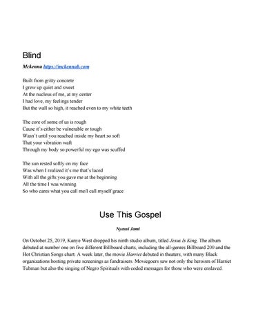 Blind Mckenna https://mckennab.com Built from gritty concrete I grew up quiet and sweet At the nucleus of me, at my center I had love, my feelings tender But the wall so high, it reached even to my white teeth The core of some of us is rough Cause it’s either be vulnerable or tough Wasn’t until you reached inside my heart so soft That your vibration waft Through my body so powerful my ego was scuffed The sun rested softly on my face Was when I realized it’s me that’s laced With all the gifts you gave me at the beginning All the time I was winning So who cares what you call me/I call myself grace
