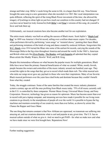 strange and bitter crop. Billie’s vocals bring the scene to life, in a larger-than-life way. Nina Simone brought the same song to a new generation when she recorded it in 1965. Her vocal interpretation was quite different, reflecting the spirit of the rising Black Power movement of the time; she allowed the imagery of lynchings to shine light on just how much our condition in this country had not changed. If you have never heard (or truly listened to) both Billie’s and Nina’s versions of this song, do yourself a favor and look them up. Unfortunately, our musical creations have also become another tool for our exploitation. The entire music industry was built on selling the success of Black music. Scott Joplin’s “Maple Leaf Rag” in 1899 was America’s first hit record, selling over a million sheet-music copies. For decades, white performers thrived by performing “coon songs” or “minstrel shows,” painting their faces Black and performing imitations of the kinds of song and dance created by enslaved Afrikans. Songwriters like W.C. Handy circa 1914 turned the Blues into some of the earliest hit records, carrying the sounds of the Mississippi Delta to the big cities throughout America and around the world. In the 1960’s, American and British white acts like Elvis Presley, The Beatles, and Led Zeppelin all admitted that they copied Blues artists like Muddy Waters, Howlin’ Wolf, and B.B. King. Despite this tremendous influence on what became the popular music for multiple generations, Black folks have never been the primary financial beneficiaries of what we created. White, mostly Jewish, people became the owners and controllers of the music industry around one hundred years ago. They owned the rights to the songs that they got us to record which made them rich. The white musical acts who stole our songs never gave any payback to those who were their inspirations. Many of our favorite Black musical performers over the years have died broke and destitute because they couldn’t benefit from what they created. Today, the struggle continues. Some of the same families that created the music industry plantation system a century ago are still the ones profiting from Black music today. 75% of all music currently sold in the U.S. is controlled by three companies: Warner Music Group, Universal Music Group, and Sony Corporation. However, technology has given us reason for optimism. Music has become easier than ever to record with just a laptop computer, and streaming services have made it possible for our living room creations to go directly to the smartphones of people all over the world. It is possible to bypass the big machines and maintain ownership of our creativity more than ever before, as shown by artists like Chance the Rapper and Gucci Mane. The one thing that remains constant is that New Afrikans are oppressed, we transmute our suffering into amazing art, and our creations determine what is cool and popular at any given time. The U.S. has no musical culture outside of what we give it. And we need to get PAID - for what we make now and what we have made since we were first brought here. Reparations Now!