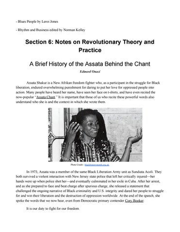 Section 6: Notes on Revolutionary Theory and Practice A Brief History of the Assata Behind the Chant Edward Onaci Assata Shakur is a New Afrikan freedom fighter who, as a participant in the struggle for Black liberation, endured overwhelming punishment for daring to put her love for oppressed people into action. Many people have heard her name, have seen her face on t-shirts, and have even recited the now-popular “Assata Chant.” It is important that those of us who recite these powerful words also understand who she is and the context in which she wrote them.