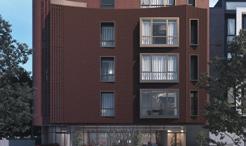 Boutique condo building Bloc24 features eight residential units, ranging from 460 square feet to 2,600 square feet, as well as ground floor retail space. The project features a modern, curved brick façade with bay windows.