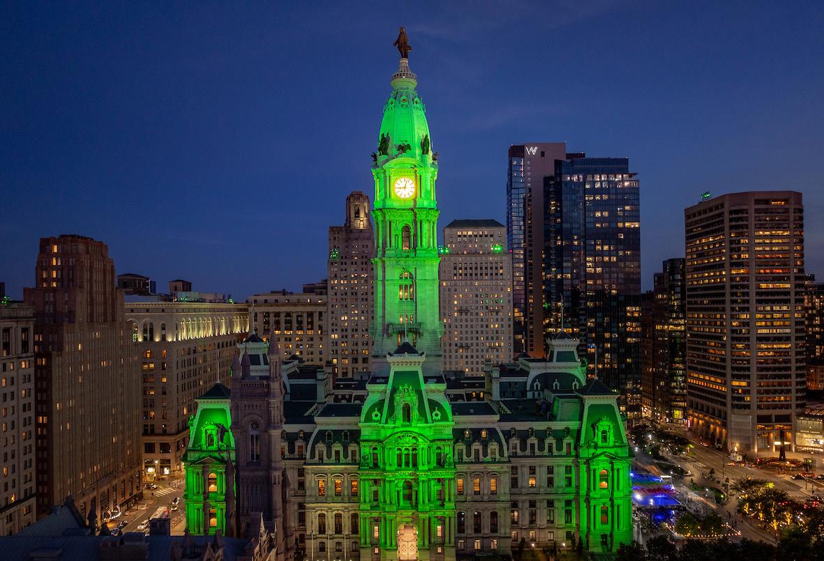 The lighting system installed in 2024 on City Hall’s historic façade has received two awards from the prestigious Illuminating Engineering Society. CCD partnered with Center City firm The Lighting Practice on the project, which utilizes the latest LED technology to bathe City Hall’s architectural features with white light, and features colorful options for holidays and local sports events.