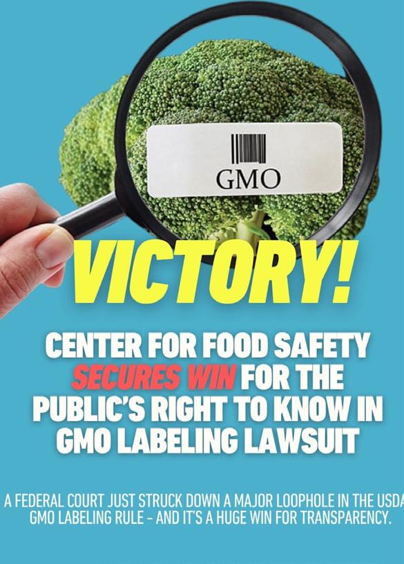 • Secured public’s right to know what’s in their food with major court victory overturning USDA’s deficient GE labeling law that hid GMOs behind QR codes and exempted ultra-processed foods.