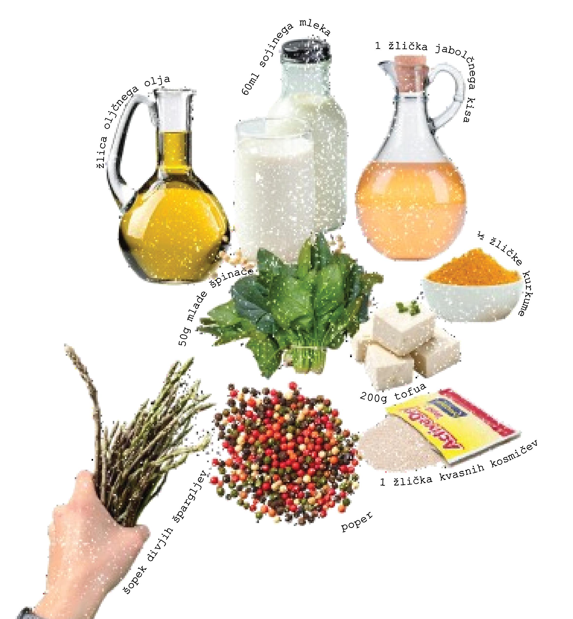Z rokami nadrobimo tofu na majhne koščke. Šparglje lahko na hitro operemo in posušimo. Odlomimo morebitne lesene dele, preostali del pa narežemo na manjše koščke. V ponvi segrejemo olje in dodamo narezane koščke špargljev , ter jih nekaj minut dušimo. Potem dodamo nadrobljen tofu in na zmernem ognju mešamo še 2-3min. Nato počasi dodajamo mleko (+/10ml, odvisno od tofuja in želene gostote). Vmes dodamo še kurkumo, sol (ne pretiravajmo s soljo saj bomo na koncu dodali še črno sol), poper in kvasne kosmiče. Vse skupaj na zmernem ognju pečemo okoli 5 minut in občasno premešamo. Minuto pred koncem dodamo še mlado špinačo in ponev pokrijemo, da špinača usahne , nato pa na koncu še enkrat premešamo.