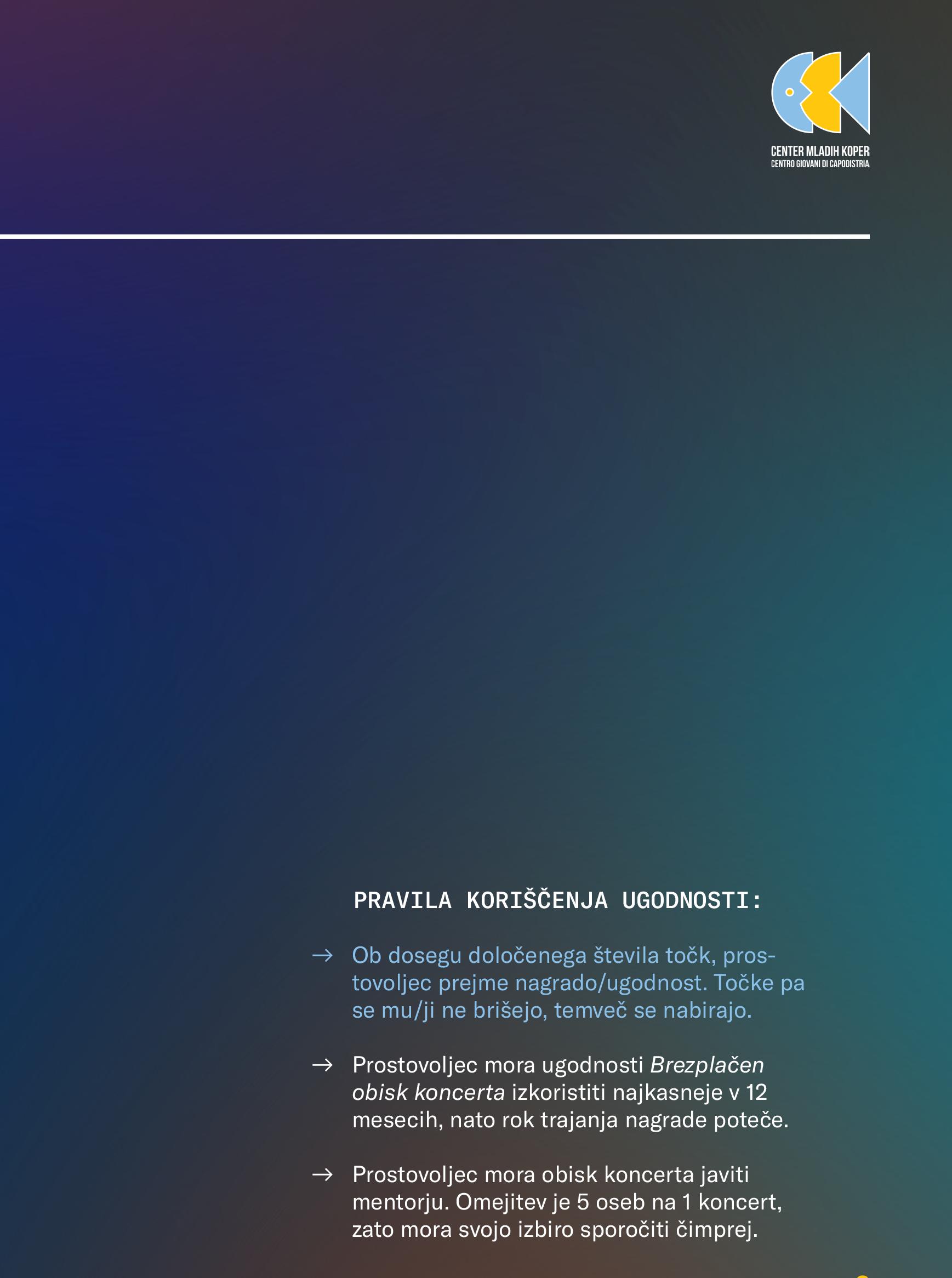 keeping alive the memory and our views of the world and what is happening in the world. I am sure that one day it will also help historians and other researchers explore the life of the period we live in. To me, the magazine represents some sort of freedom – a place where your thought and creativity are always welcome.” – Mark “I organised a number of concerts and workshops, and I am very happy with this cooperation because without the help of the youth centre, I would not have been able to achieve all this. I am grateful for everything that CMK enables young people, and I am convinced that many cities would function better if they had a youth centre like the one we (young people) have in Koper.” – David Nik