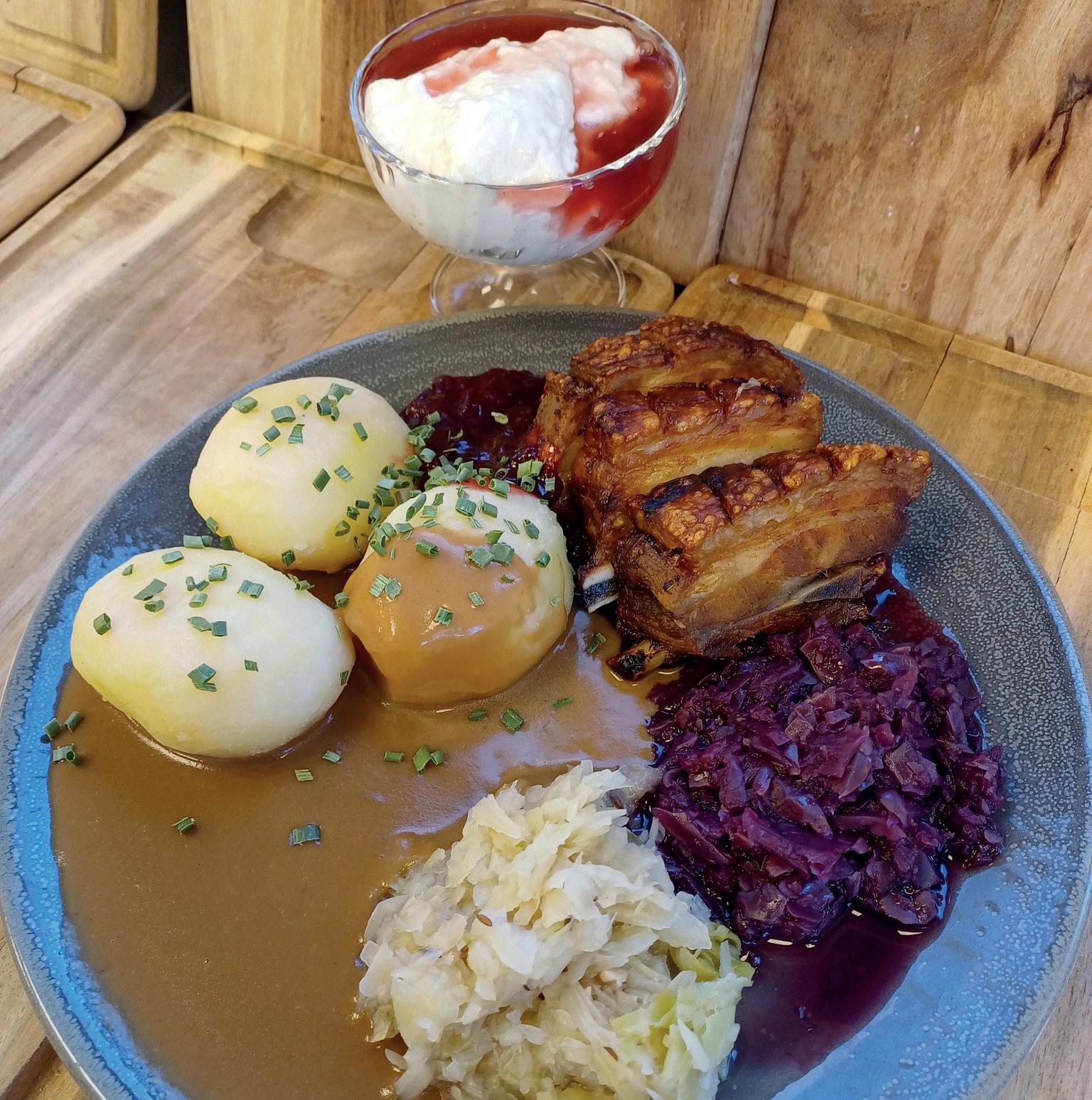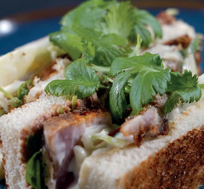 (Sandwich m/sprøstekt ribbe, syltet gulrøtter og daikon, agurk, paté, majones, chili, koriander og soyasaus)