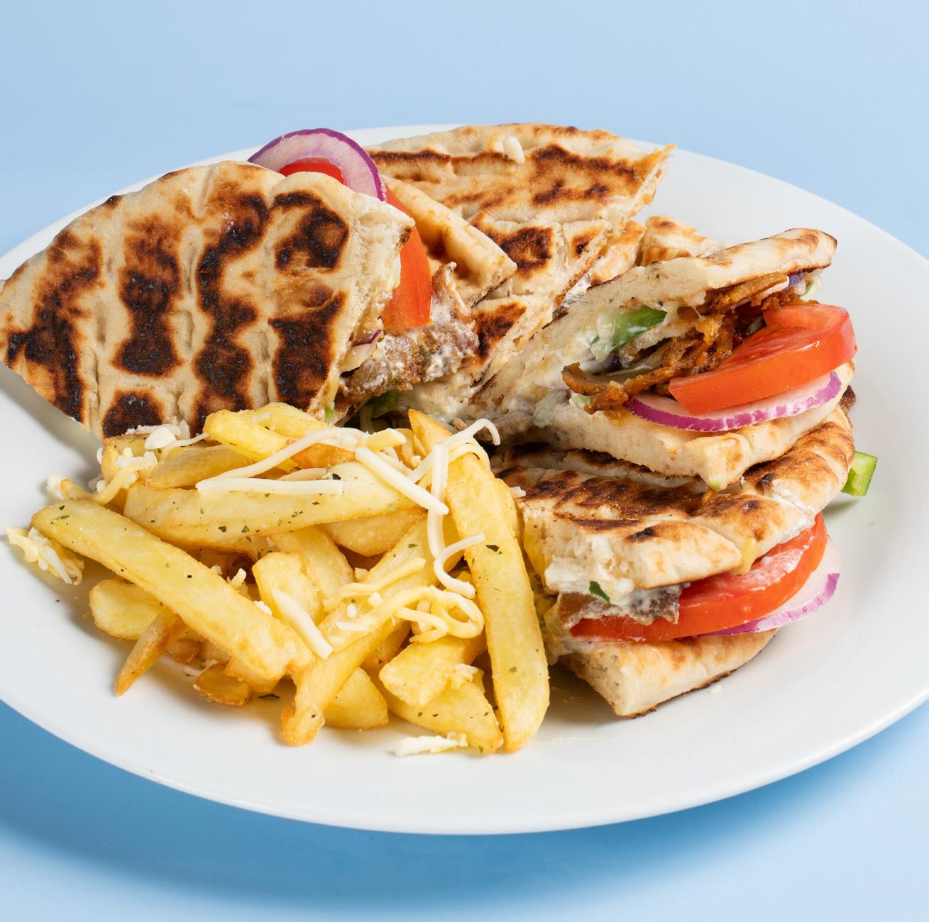 Gyros kjøtt med kylling eller svin, ost, tzatziki, tomat, paprika, løk og pita brød + pommes frites (Ord. pris 235,- nå 188,-)