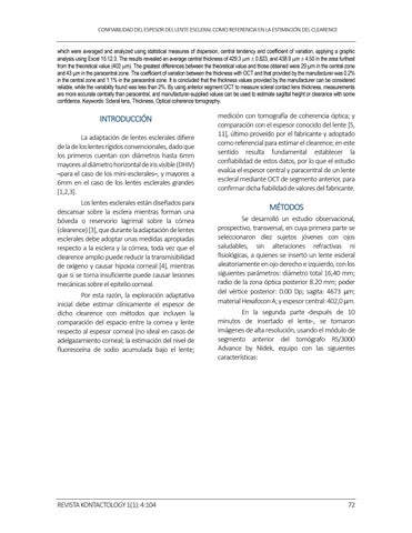 INTRODUCCIÓN El humor acuoso es un fluido encargado de mantener la presión interna del ojoy permitir el intercambiodesolutos entrela sangreyel estroma conformaconjuntivaldispositivostécnicasescleralestecnológicosadelgazamientommHg)reducidosrigidezevidenciahomeostáticoselevadas,estrechonormalesrelevanciaevacuacióncapazdemostradodelaproximadamenteincremento.elascélulasfuncionaconvencionalmediantecámaraciliar,favoreciendolaeliminacióndedesechosdelaanterior[1]atravésdelhumoracuoso,lasvíasconvencional(trabecular)yno(úveoescleral).Lavíatrabecularmediantelasinvaginacionesyporosdelasendotelialesquefacilitaneldrenajeacuoso,cualessondependientesdelaPIOmientrasquelflujodesalidaaumentalinealmenteconsuLavíaúveoescleralfacilitaentreel10y20%delasalidahumoracuoso,aunqueestudiosrecientessehaqueenadultosjóvenesestavíaesdeeliminarentreun25y57%,comotasadeacuosaqueleproporcionamayorenelmantenimientodelaPIO.LasvariacionesdelaPIOenindividuossemantienendentrodeunrangosinproducirpresionespersistentementeyaqueexistenmecanismospararegularlaPIO[2].ExisteclínicadelainfluenciadelespesorycornealenlaPIO,asociadaconvaloresencasosdequeratocono(inferioresa10encórneasquenormalmentepresentanyflacidez[3]Porsuparte,losrecientesavancesenmateriadelentesdecontacto(LC),reflejadosenmateriales,diseñosydefabricación,permitenquedichosmédicosdescansensobreeltejidosubyacentealaescleramientrasunabóvedasobrelacórneayellimbo[4]