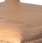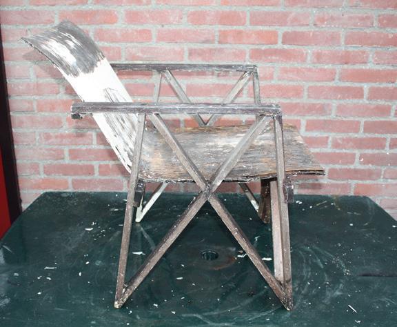 N: “Een kennis van Rietveld vond de lattenstoel die ze net bij hem had gekocht vrouwonvriendelijk in het gebruik. Ze vond de hoge leuning niet geschikt om met een knot tegenaan te leunen. Op haar verzoek kortte hij de rugleuning in. Maar we laten ook eigentijdse reacties op de stoel zien. Tim Breukers maakte er een van keramische bouwmaterialen. Maarten Baas joeg de vlam erin en studio Superflex liet hem in Zanzibar uitvoeren in tropisch hardhout. Hij lijkt erop en toch ook weer niet. Een vreemde gewaarwording die ook vragen stelt over origineel, kopie en interpretatie.”