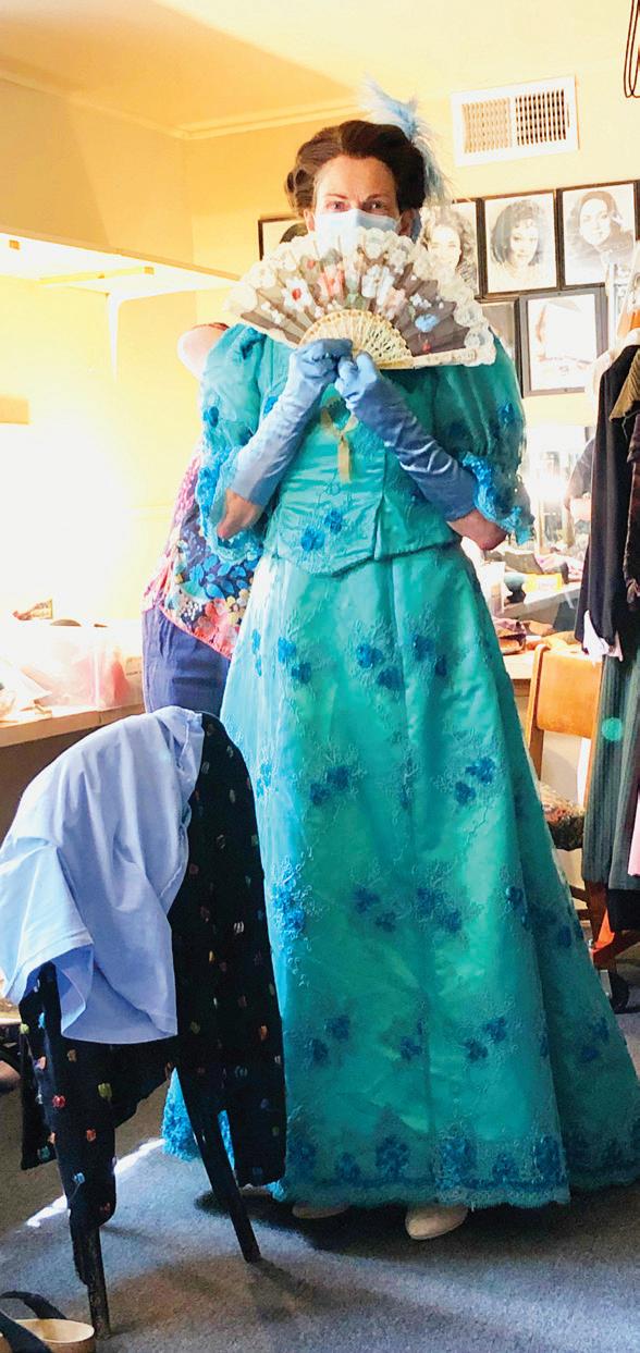 transformed! Jim McGough and Elyse Messick, Supervisor and Assistant respectively for Wigs and Makeup, prepared my head for the wig and feather adornment. And Bettina Bierly, Costume Coordinator for Die Fledermaus, tailored my gown and accessorized with fan, shoes & gloves.
