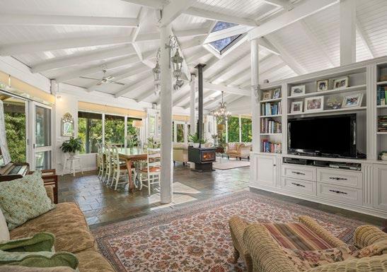 space. Free-flowing interiors feature dual lounge areas plus a spacious family room with a wood-burning stove, while the modern kitchen has stone benchtops, an induction cooktop and a walk-in pantry.