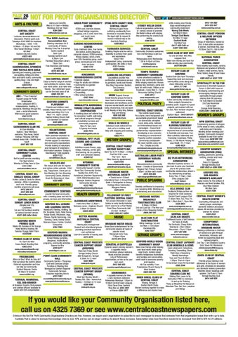 If you would like your Community Organisation listed here, call us on 4325 7369 or see www.centralcoastnewspapers.com Entries in the Not For Profit Community Organisations Directory are free. However, we require each organisation to subscribe to each newspaper to ensure that someone from that organisation keeps their entry up to date. Australia Post is about to increase their postage rates by over 42% and we can no longer continue to absorb these increases. Subscription rates have therefore needed to be increased from $50 to $75 for 25 editions.