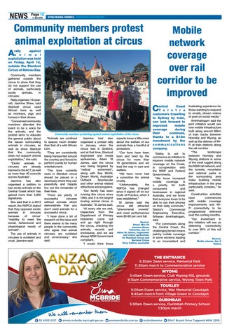 rally against a n i m a l exploitation was held on Friday, April 12, outside the Stardust Circus at Bateau Bay. Community members gathered outside the circus to show that they do not support the use of animals, particularly exotic animals, in circuses. Rally organiser, 19-yearold, Jasmine Shaw, said Stardust circus used African lions as well as monkeys, pigs and horses in their shows. “Concerned community members attended the event to be a voice for the animals, and the protest aims to educate the general public about the issues surrounding animals in circuses, as well as show Stardust that the community does not support animal exploitation,” she said. “Exotic animals in circuses are already banned in the ACT, as well as more than 40 councils across Australia”. Jasmine has also organised a petition to ban exotic animals on the Central Coast which has gained more than 4,000 signatures. She said that in a 2013 report, the RSPCA stated that they opposed exotic animals in circuses because of circus’ “inability to meet the social, behavioural and physiological needs of animals”. The use of animals in circuses is outdated and cruel, Jasmine said.