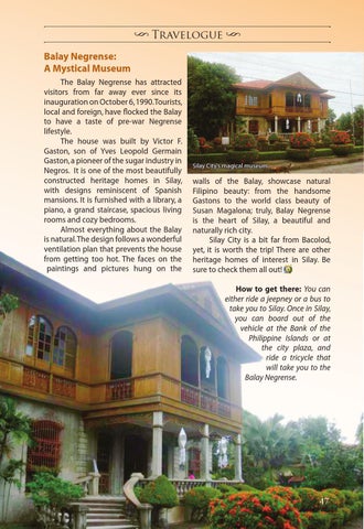 walls of the Balay, showcase natural Filipino beauty: from the handsome Gastons to the world class beauty of Susan Magalona; truly, Balay Negrense is the heart of Silay, a beautiful and naturally rich city. Silay City is a bit far from Bacolod, yet, it is worth the trip! There are other heritage homes of interest in Silay. Be sure to check them all out! How to get there: You can either ride a jeepney or a bus to take you to Silay. Once in Silay, you can board out of the vehicle at the Bank of the Philippine Islands or at the city plaza, and ride a tricycle that will take you to the Balay Negrense.