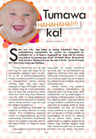 abi raw nila, ‘ang buhay ay parang telenobela.’ May mga pagkakataong mapapaluha ka, maiinis ka, magugulat ka, matatakot ka, o ‘di kaya’y magagalit ka. ang sabi ko naman, ‘ang buhay ay parang gag show!’ at bakit? Ewan. Eh gusto ko lang tumawa. Maging masaya. Ika nga ni Enrile, “gusto ko happy ka!” Kaya tawa lang mga kaibigan. Tuwing nakakarinig ako ng mga tawa ng tao, ang mga tenga ko ay napapangiti sapagkat para sa akin, ito ay isa sa pinakamagagandang tunog na pwedeng malikha sa magulo at mapag-imbot nating mundo. Walang lugar ang mga sigaw, hagulgol, at mga malulungkot na luha sa sulatin kong ito kaya balewalain niyo na lang ang huling kong sinabi. Kahit puro tawa lang ang mababasa niyo rito, hindi ito nangangahulugan na nakakatawa ang sinulat ko bagkus, sabay nating aalamin kung ano nga ba talaga ang pagtawa. Ang siyentipikong kahulugan ng pagtawa ay isang reaksyon sa isang stimulus. Ito’y kadalasang nagiging biswal na pagpapahayag ng ating nadaramang kasiyahan. Kadalasang nauuwi sa pagtawa ang mga joke na naririnig, kililitian, at kung ano pang stimuli. Ang pagtawa ay parte ng ating the CEntRALeCHO