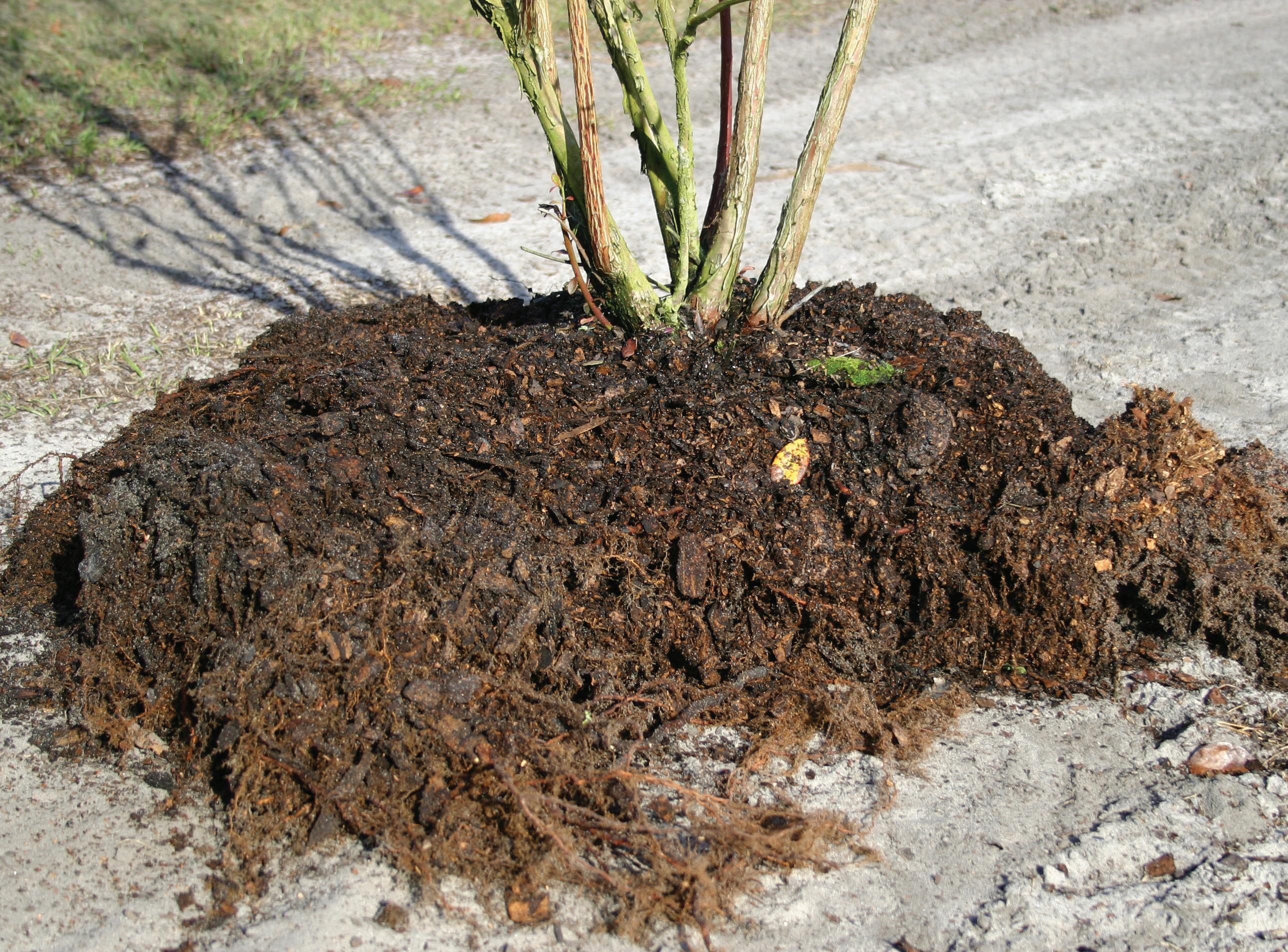 Figure 1. Excavated southern highbush blueberry plant grown in a pine bark bed. The shallow, fibrous root system was primarily limited to the depth of the pine bark, with very few roots penetrating the underlying soil. Credits: JEFF WILLIAMSON