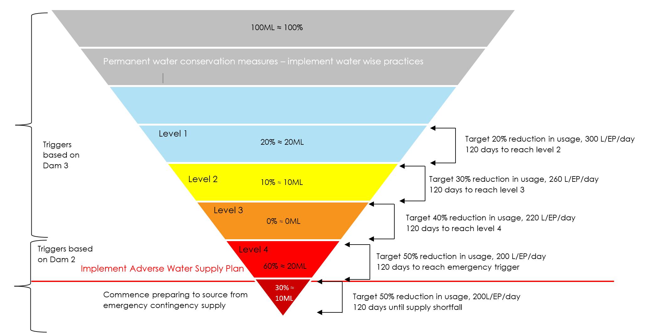 Target 50% reduction in usage, 200 L/EP/day 120 days between level 4 and emergency