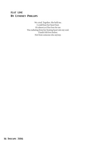 flat line By Lyndsey Phillips We cried. Together. She held me. I could hear her heart beat. It’s almost as if her love for me Was radiating from her beating heart into my soul. I hadn’t felt love before. Not from someone else anyway.