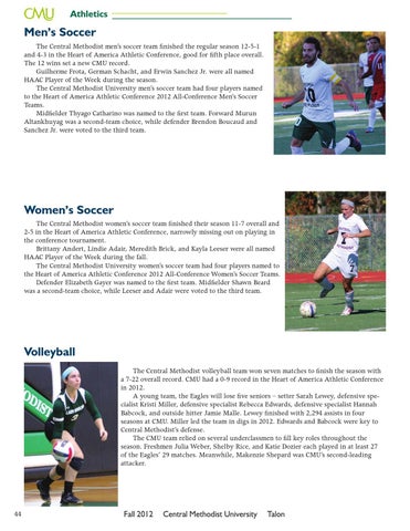Men’s Soccer The Central Methodist men’s soccer team finished the regular season 12-5-1 and 4-3 in the Heart of America Athletic Conference, good for fifth place overall. The 12 wins set a new CMU record. Guilherme Frota, German Schacht, and Erwin Sanchez Jr. were all named HAAC Player of the Week during the season. The Central Methodist University men’s soccer team had four players named to the Heart of America Athletic Conference 2012 All-Conference Men’s Soccer Teams. Midfielder Thyago Catharino was named to the first team. Forward Murun Altankhuyag was a second-team choice, while defender Brendon Boucaud and Sanchez Jr. were voted to the third team.