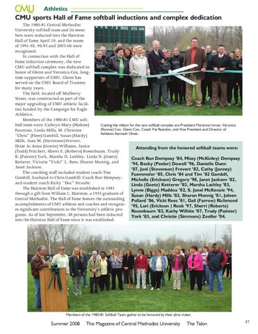 CMU sports Hall of Fame softball inductions and complex dedication The 1980-81 Central Methodist University softball team and its members were inducted into the Hairston Hall of Fame April 19, and the teams of 1991-92, 94-95 and 2003-04 were recognized. In connection with the Hall of Fame induction ceremony, the new CMU softball complex was dedicated in honor of Glenn and Veronica Cox, longtime supporters of CMU. Glenn has served on the CMU Board of Trustees for many years. The field, located off Mulberry Street, was constructed as part of the major upgrading of CMU athletic facilities funded by the Campaign for Eagle Athletics. Members of the 1980-81 CMU softball team were: Cathryn Mary (Malone) Cutting the ribbon for the new softball complex are President Marianne Inman, Veronica (Ronnie) Cox, Glenn Cox, Coach Pat Reardon, and Vice President and Director of Fountain, Linda Mills, M. Christine Athletics Kenneth Oliver. “Chris” (Fleer) Gambill, Susan (Hardy) Mills, Joan M. (Stevenson) Frevert, Dixie Jo Anne (Gowin) Williams, Janice Attending from the honored softball teams were: (Todd) Pritchett, Sherri E. (Roberts) Rosenbaum, Trudy K. (Painter) York, Marsha D. Lashley, Linda N. (Goetz) Coach Ron Dempsay ’84, Missy (McKinley) Dempsay Ketterer, Victoria “Vicki” L. Rees, Sharon Monnig, and ’94, Becky (Peeler) Dowell ’96, Danielle Dunn Janet Jackson. ’07, Joni (Stevenson) Frevert ’82, Cathy (Janney) The coaching staff included student coach Tim Fuemmeler ’85, Chris ’84 and Tim ’82 Gambill, Gambill, husband to Chris Gambill; Coach Ron Dempsey; Michelle (Erickson) Gregory ’98, Janet Jackson ’82, and student coach Ricky “Doc” Straube. Linda (Goetz) Ketterer ’83, Marsha Lashley ’83, The Hairston Hall of Fame was established in 1983 Lynne (Biggs) Maddox ’02, S. Jonel McKenzie ’94, through a gift from William L. Hairston, a 1933 graduate of Susan (Hardy) Mills ’83, Sharon Monnig ’81, Joleen Central Methodist. The Hall of Fame honors the outstanding Pollard ’06, Vicki Rees ’81, Gail (Farrow) Richmond accomplishments of CMU athletes and coaches and recogniz- ’95, Lori (Erickson ) Rook ’97, Sherri (Roberts) es significant contributions to the University’s athletic proRosenbaum ’82, Kathy Wilhite ’07, Trudy (Painter) grams. As of last September, 48 persons had been inducted York ’83, and Christie (Simmons) Zoeller ’04. into the Hairston Hall of Fame since it was established.