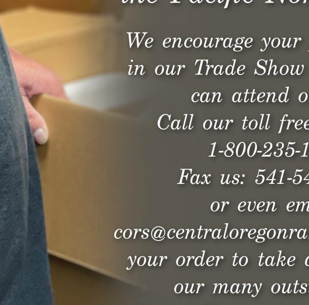 Let us help you get the heavy items. If you are unable to attend the Trade Show or need a hand getting your purchases back to your ranch... We deliver! Give us a call 541-548-5195 or email cors@centraloregonranchsupply.com to get on our delivery schedule. Delivering to..... John Day - Burns - Silver Lake - Klamath Falls - LakeviewBend - Sisters - Terrebonne - Prineville - Powell Butte - Vale - Juntura - Paulina - Culver - Madras - Western Oregon I-5 Corridor - and More! We are making it easier to shop wi us! We Deliver! page 3 - CORS TRADE SHOW - September, 2023
