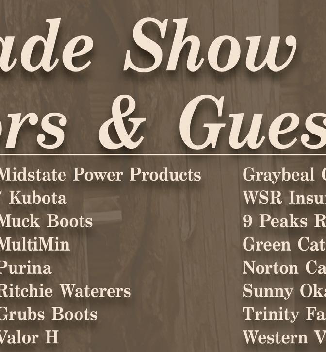 Made in the West. Made for the West. LMF Senior $22.00/Bag LMF Development $25.00/Bag LMF Super Su lement $33.00/Bag Compliments Western hays and forages U lizes Organic Selenium, Natural Vitamin E and Chelated Minerals Available in mul ple formulas to a omodate work levels, life stages and special n ds page 60 - CORS TRADE SHOW - September, 2023