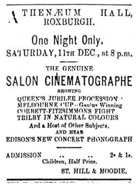 Films have been screened at this site for almost 130 years, with films initially delivered by stagecoach. An advertisement in the Mount Benger Mail (1897) highlighted some of the early films shown at the Roxburgh Athenaeum Hall, including the Queen's Jubilee Procession, the Melbourne Cup and the CorbettFitzsimmons fight.