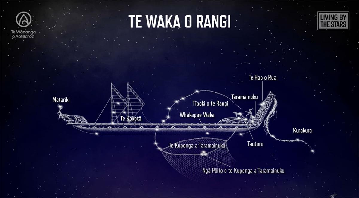 The constellation known as “Te Waka o Rangi” is connected to the setting of Matariki. Known by a variety of names based on regional kōrero, Te Waka o Rangi is a canoe with Matariki at the front and Tautoru, or Orion’s Belt, at the back. The waka is captained by a star named Taramainuku, who casts his net, Te Kupenga a Taramainuku, each evening upon the Earth and hauls up the souls of those who have died that day.