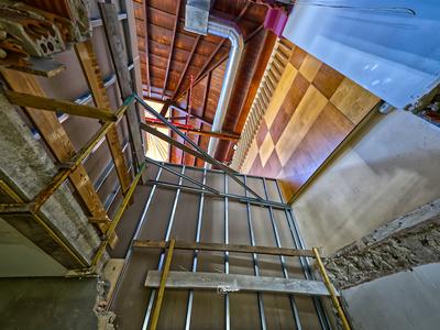 Obertura d'una escala auxiliar d'evacuació en cas d'incendi, que comunicarà la Sala amb el carrer, tal com obliga la normativa actual. Aquesta escala fa l'entrega al passadís d'entrada principal.