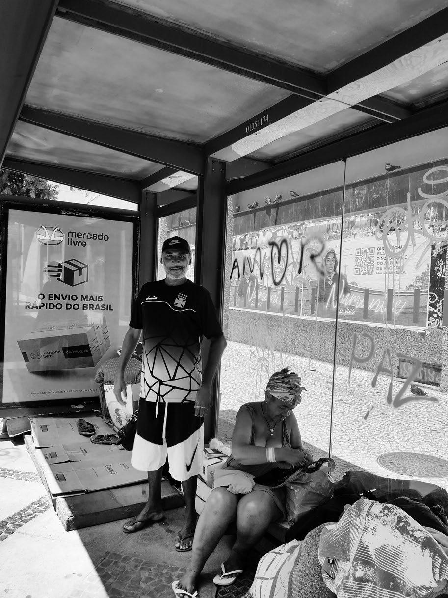 é a série fotográfica do casal que se instalou na parada de ônibus. O colchão de espuma, coberto pela colcha de papelão; a caixa de papelão que se transforma em armário; uma garrafa com flores em cima de sacolas e, pintada no vidro da parada de ônibus como se fosse um quadro, a expressão do sentimento que os une nessa jornada: ‘amor’. As fotografias que compõem ‘Amores de papelão’ têm expressividade e força metafórica e chamam atenção não apenas para a apreensão desta realidade social, mas para a violenta impossibilidade de revelação e expressão da vida amorosa das pessoas em situação de rua nos espaços públicos citadinos.
