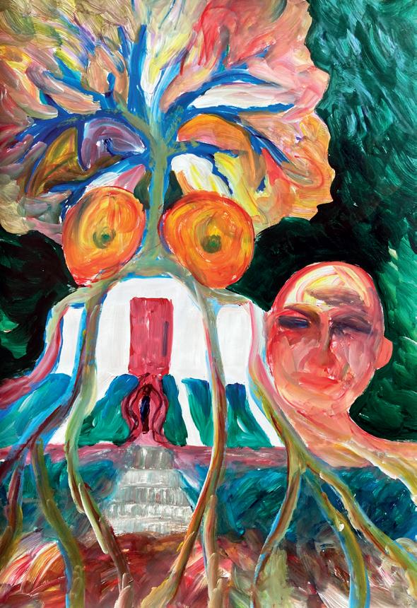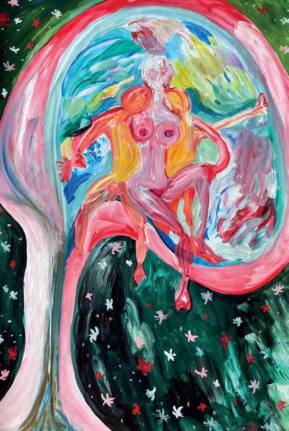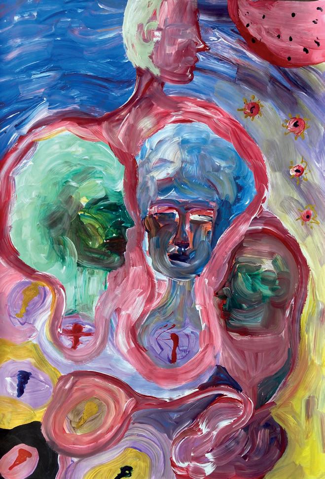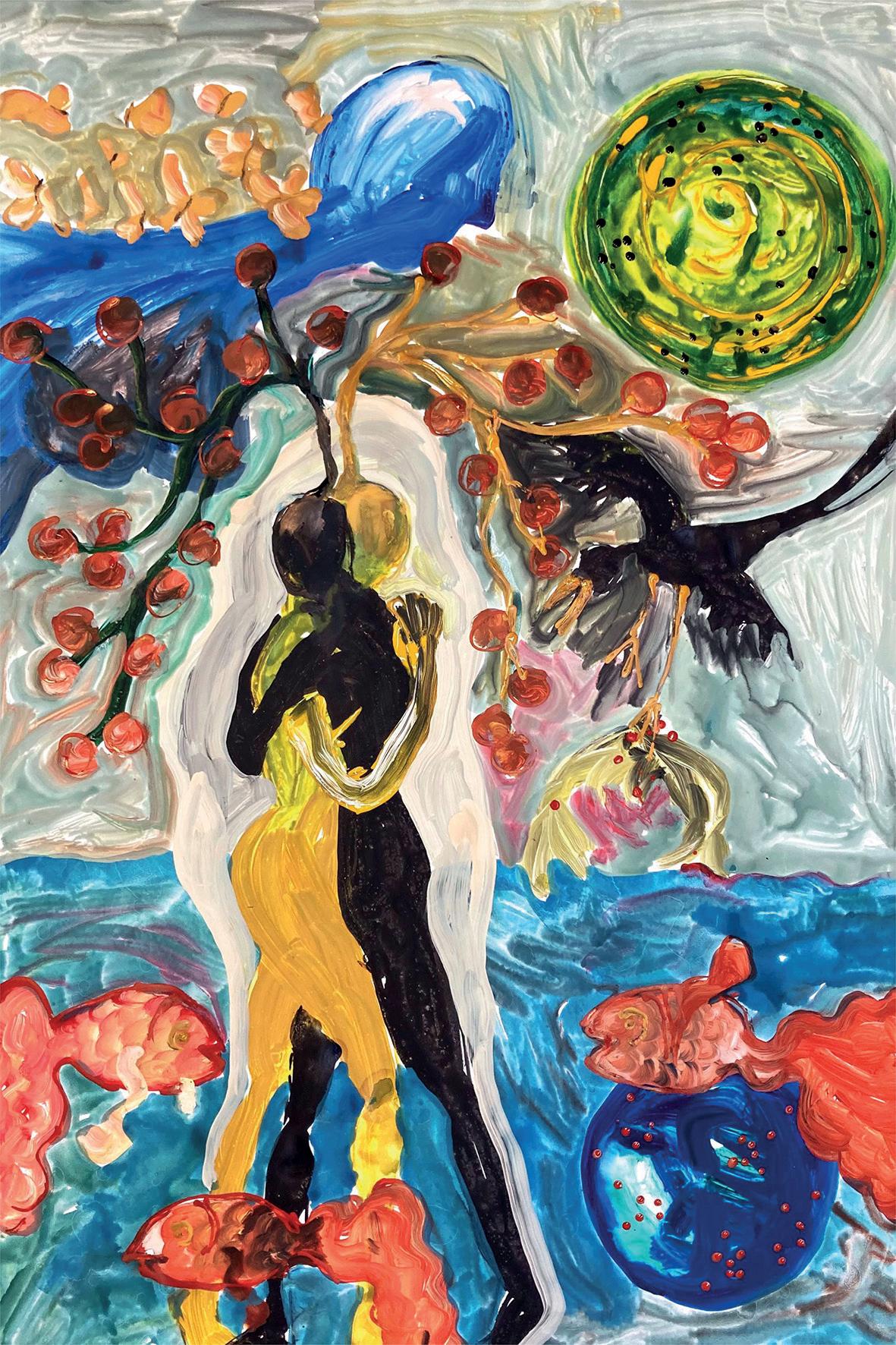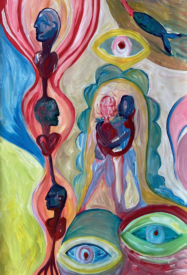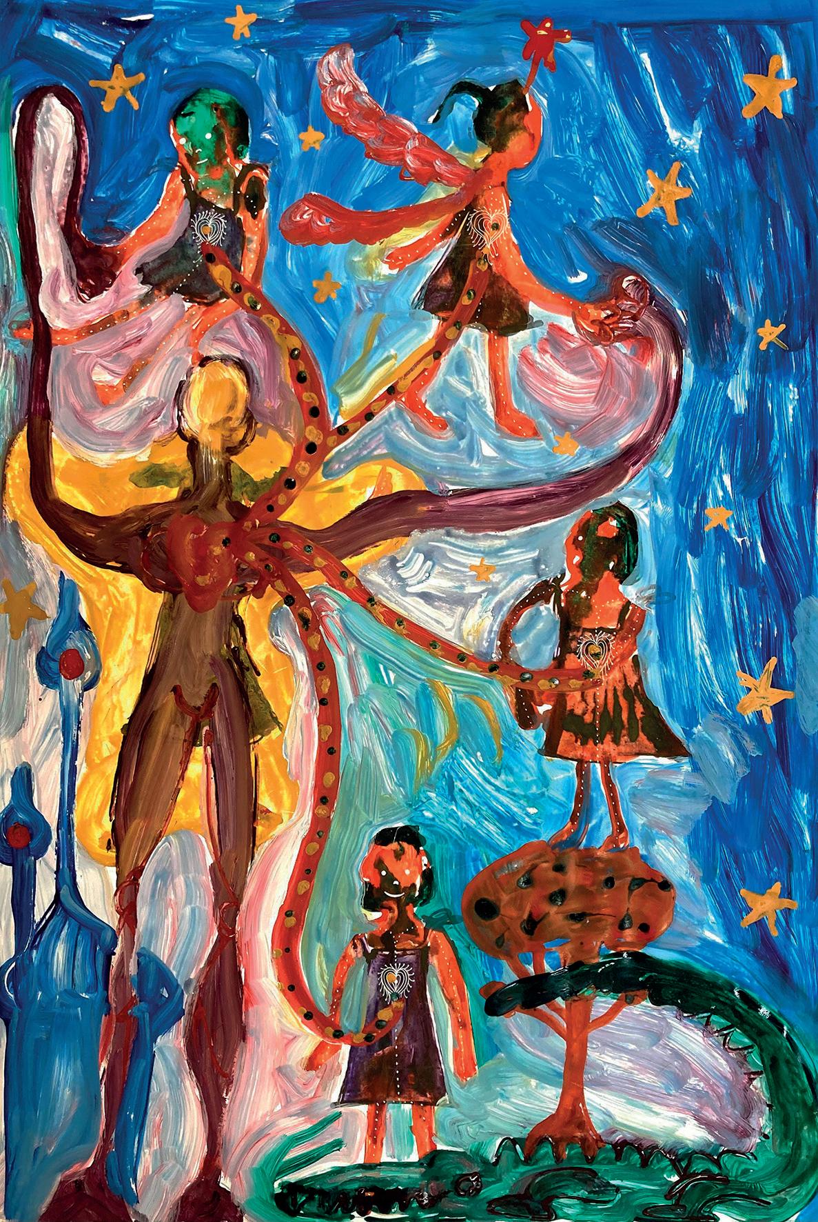 Seu figurativo não é representação fiel e restritiva do real, mas abertura de diálogos pujantes diante das sensações, descobertas, dos assombros e pensamentos que pulsam de forma cíclica, integrada e inesgotável. Amálgamas de corpos humanos, seres fantásticos, aves, anjos, árvores, casas, sóis, luas... Nos cenários coloridos, braços se abraçam, flores nascem nos cabelos das grávidas, seres se olham profundamente, se conectam e se completam, evocando conhecimentos sensoriais para além do espaço da tela ou do papel. Todas as oferendas e todos os devaneios cabem, se combinam e se articulam na natureza espontânea do sonho. As imagens oníricas casam o natural e o ordinário com o sagrado e o esdrúxulo.