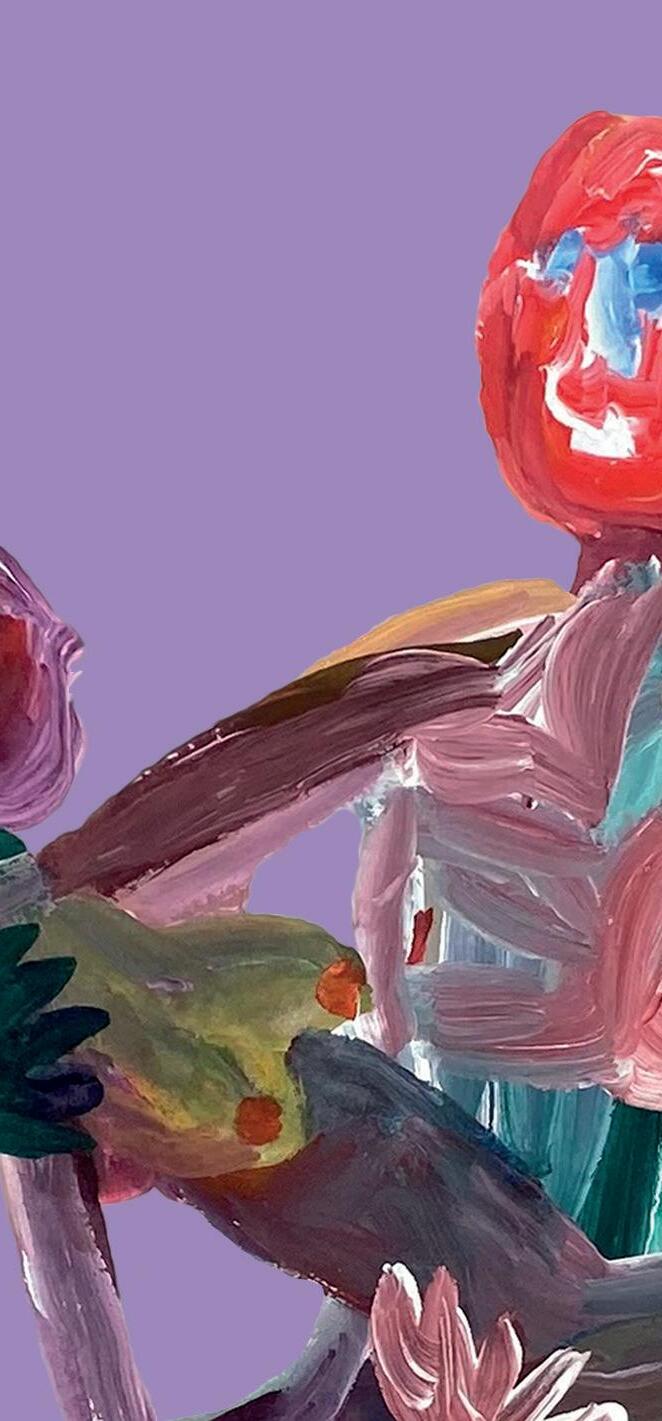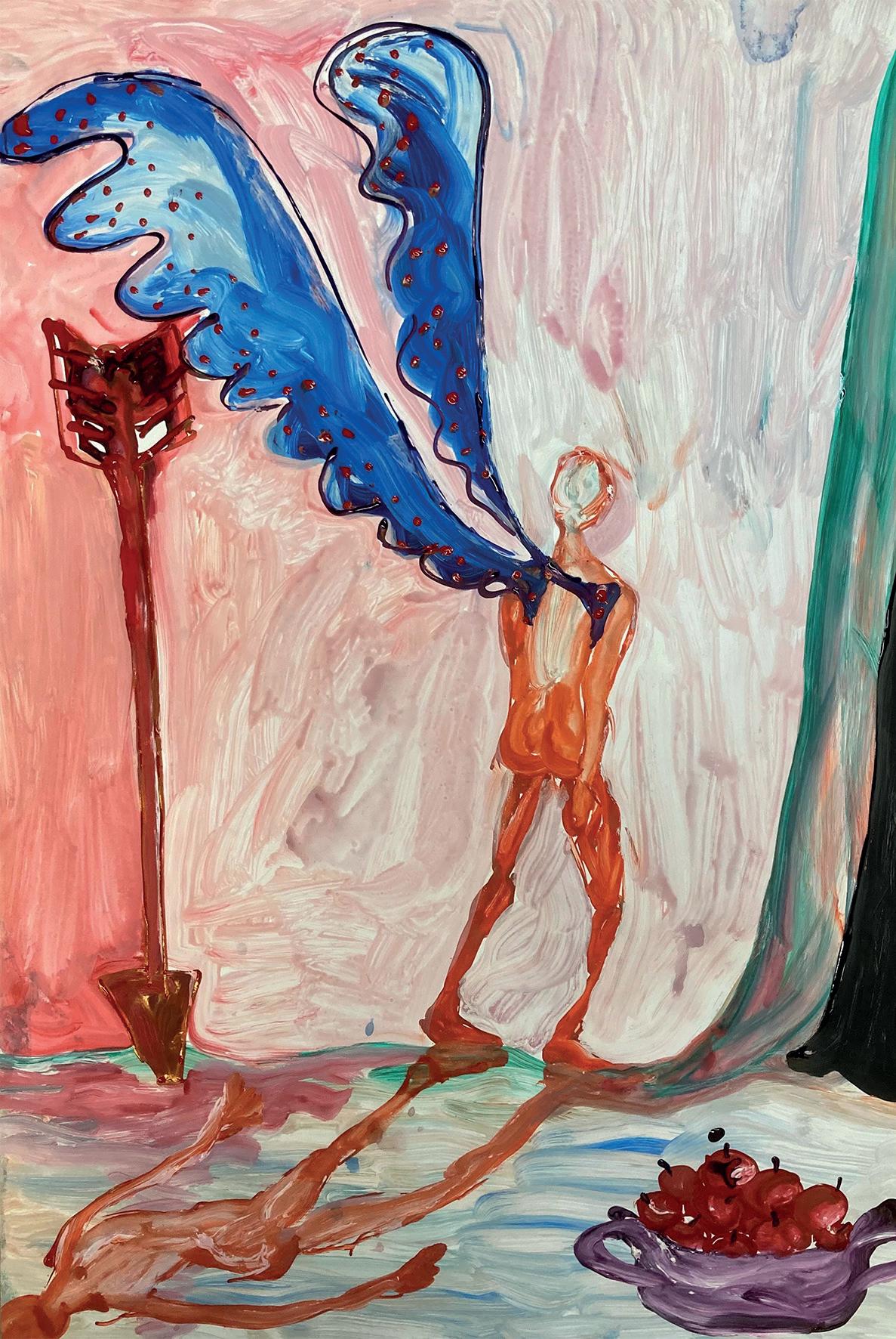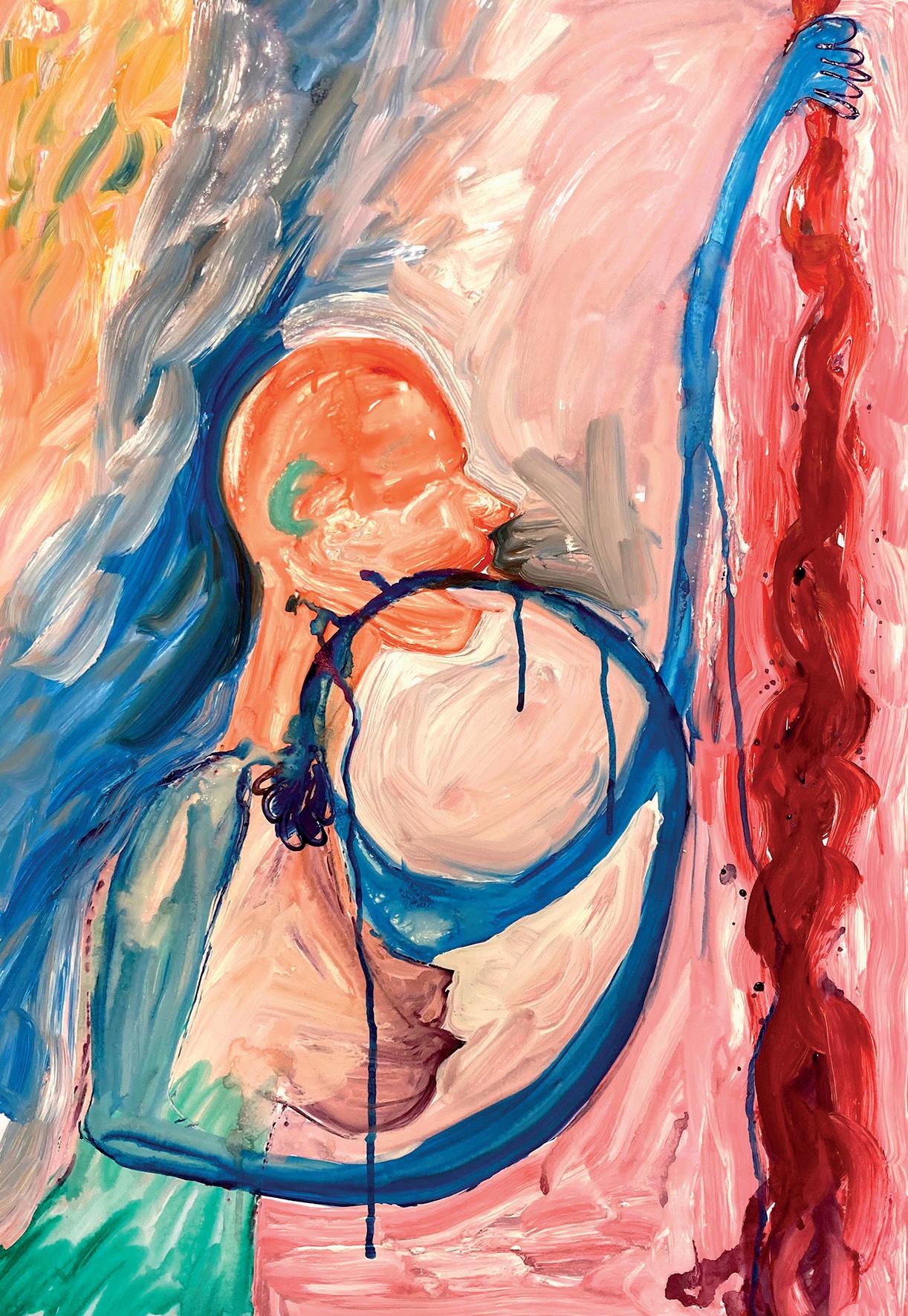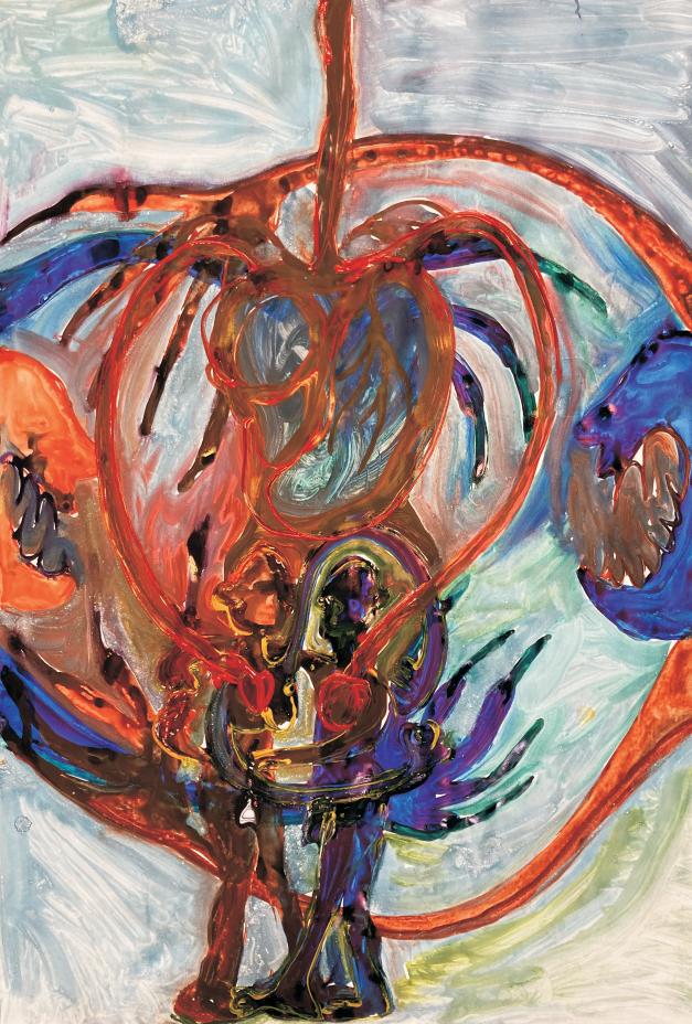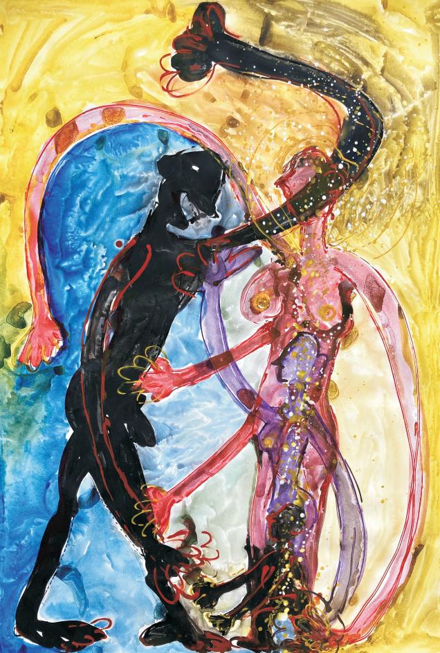Seu figurativo não é representação fiel e restritiva do real, mas abertura de diálogos pujantes diante das sensações, descobertas, dos assombros e pensamentos que pulsam de forma cíclica, integrada e inesgotável. Amálgamas de corpos humanos, seres fantásticos, aves, anjos, árvores, casas, sóis, luas... Nos cenários coloridos, braços se abraçam, flores nascem nos cabelos das grávidas, seres se olham profundamente, se conectam e se completam, evocando conhecimentos sensoriais para além do espaço da tela ou do papel. Todas as oferendas e todos os devaneios cabem, se combinam e se articulam na natureza espontânea do sonho. As imagens oníricas casam o natural e o ordinário com o sagrado e o esdrúxulo.