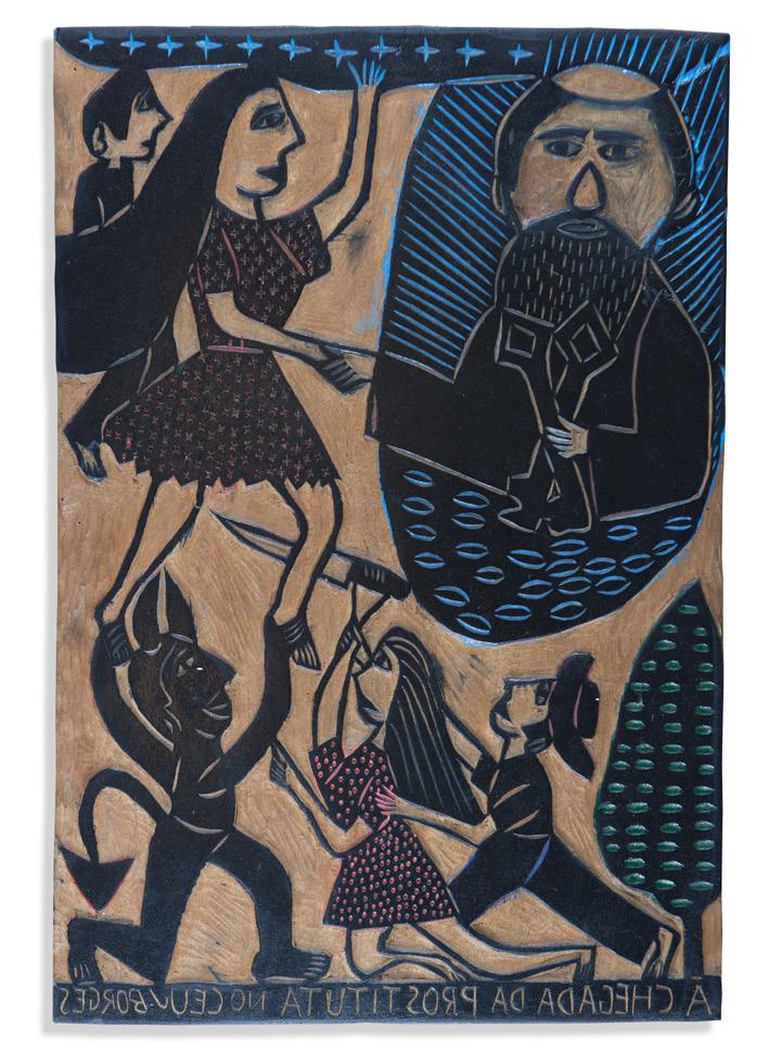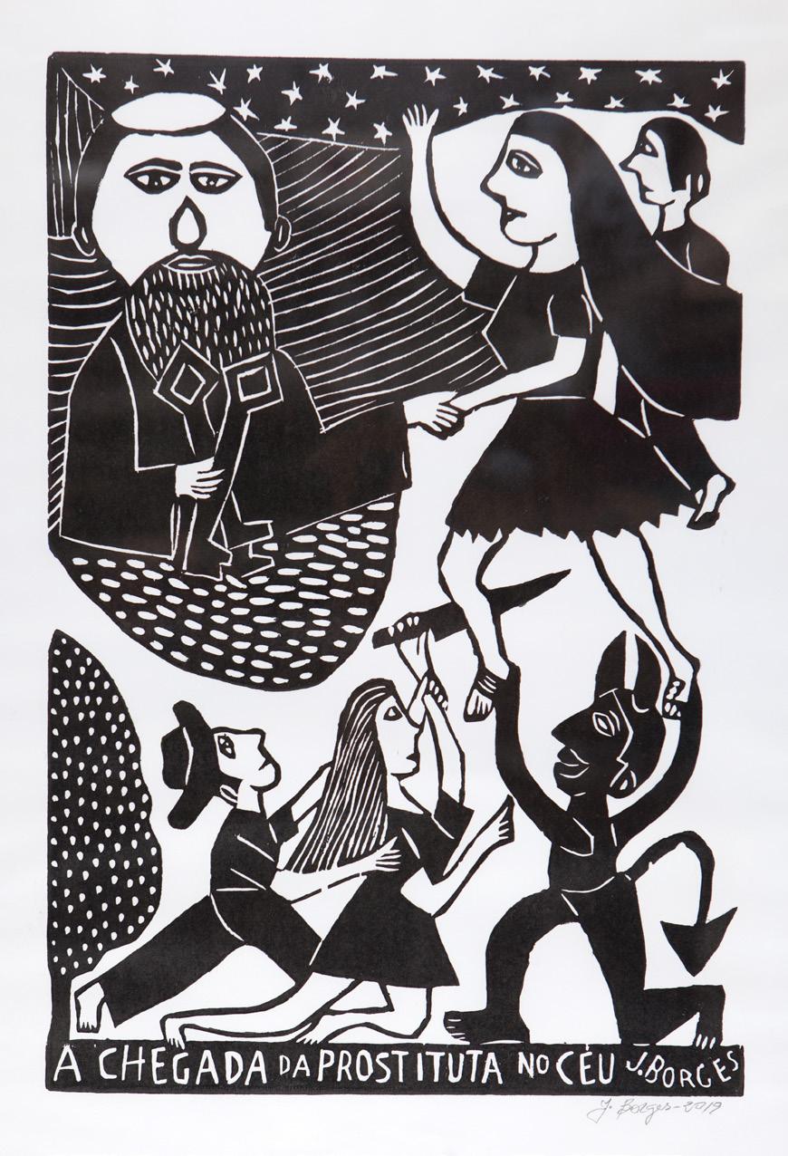 Some of the woodcuts featured in the exhibition are highly significant in J. Borges’s career. For A chegada da prostituta no céu, his best-selling work to date, the exhibition presents the woodblock, the woodcut, and the cordel booklet. The exhibition also features his critically acclaimed masterpiece O monstro do sertão [The Monster of the Sertão], widely considered his most poetic work and hailed by master Ariano Suassuna as J. Borges’s finest work.