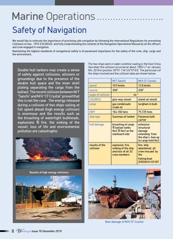 Double hull tankers may create a sense of safety against collisions, allisions or groundings due to the presence of the double hull space and the inner shell plating separating the cargo from the ballast. The recent collision between M/T “Sanchi” and M/V “CF Crystal” proved that this is not the case. The energy released during a collision of two ships sailing at full speed ahead (high energy collision) is enormous and the results such as the breaching of watertight bulkheads, explosions & fire, the sinking of the vessel, loss of life and environmental pollution are catastrophic.
