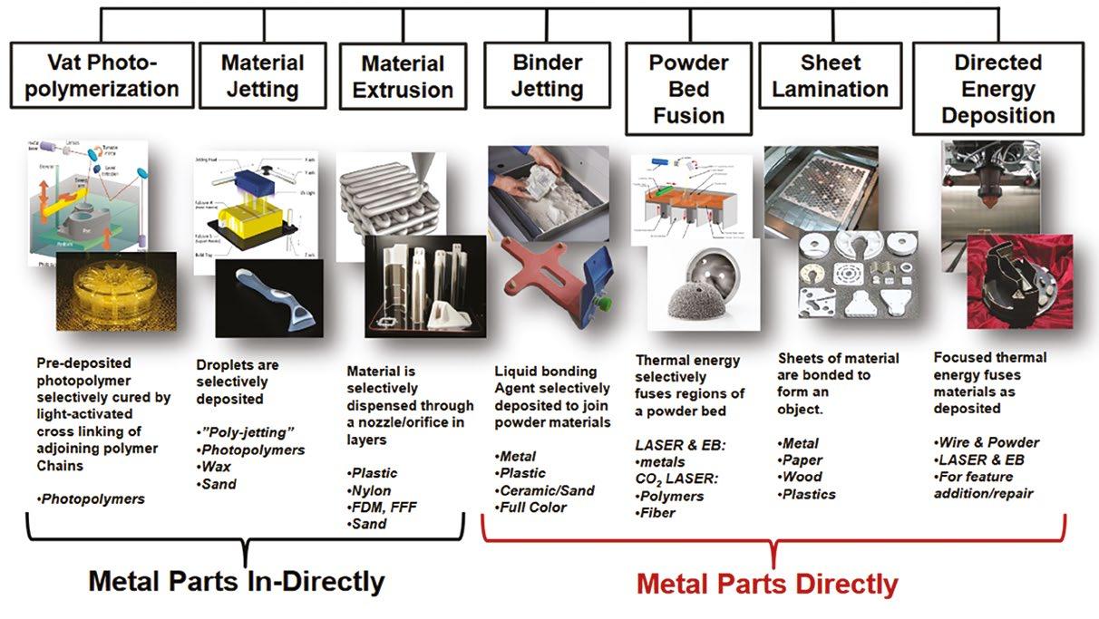 1.Vat Photo-polymerization, 2. Material Jetting, 3. Material Extrusion, 4. Binder Jetting, 5. Powder Bed Fusion (3D printing technique mostly used in the marine industry), 6. Sheet Lamination, 7. Directed Energy Deposition. This can be used for repairs, or for adding to an existing object.