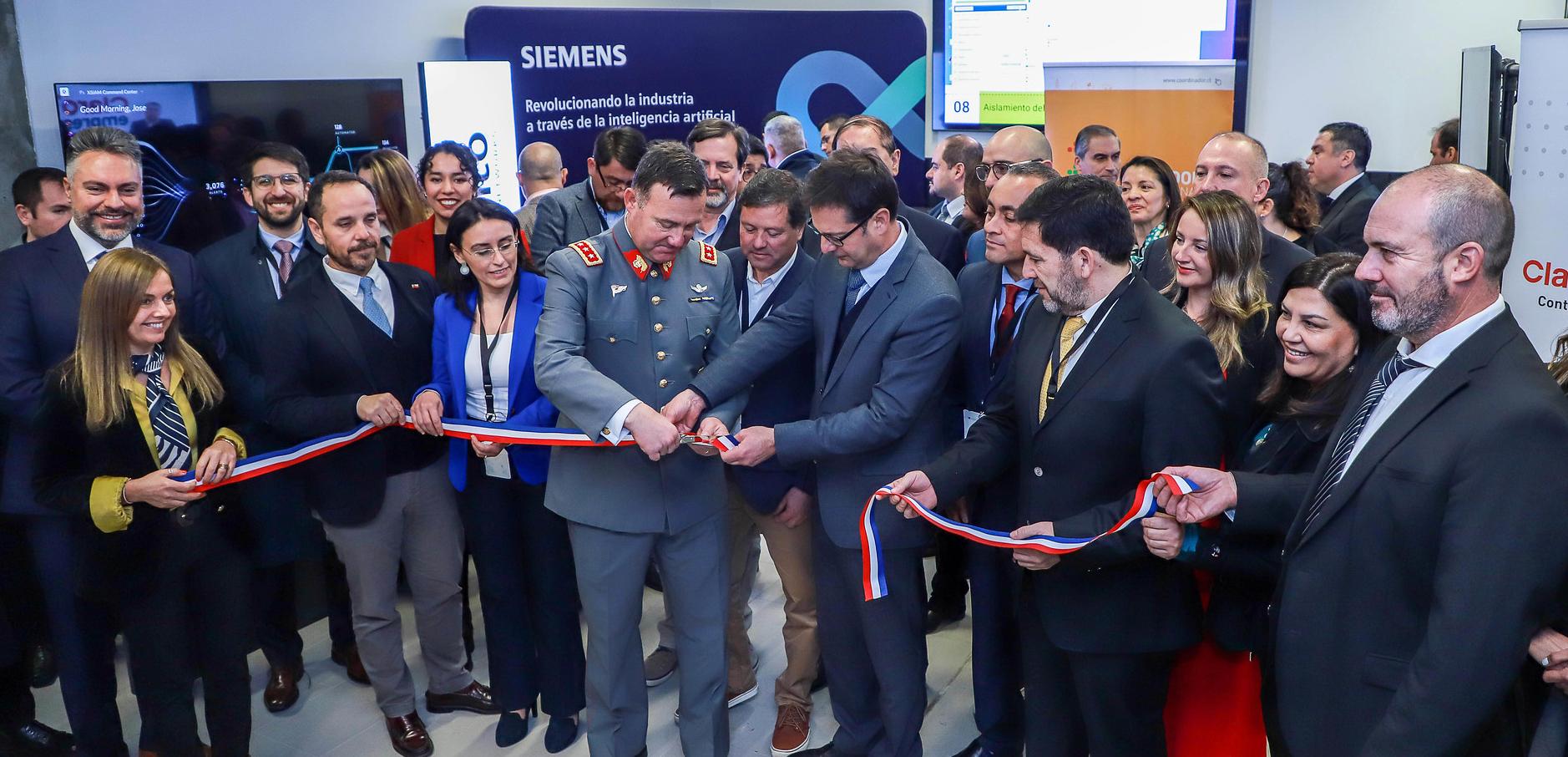 Corte de cinta en la ceremonia de inauguración de CiberLab. De izquierda a derecha, en primer plano: Marcela Briones (Directora de Asuntos Corporativos y Comunicaciones del Centro de Innovación UC), Rodrigo Ríos (Director Strategic Alliances LATAM de Dreamlab Technologies LATAM), Mabel Leva (Directora Ejecutiva de Conecta Logística), GDD. Cristian Guedelhoefer (Comandante de Educación y Doctrina del Ejército de Chile), Pedro Bouchon (ex Vicerrector de Investigación UC), Cristián Vega (Gerente de Operaciones y Tecnología de ABIF), Alejandra Acuña (Directora Escuela de Informática y Telecomunicaciones de Duoc UC), y Ramón Molina (Director Ejecutivo del Centro de Innovación UC).
