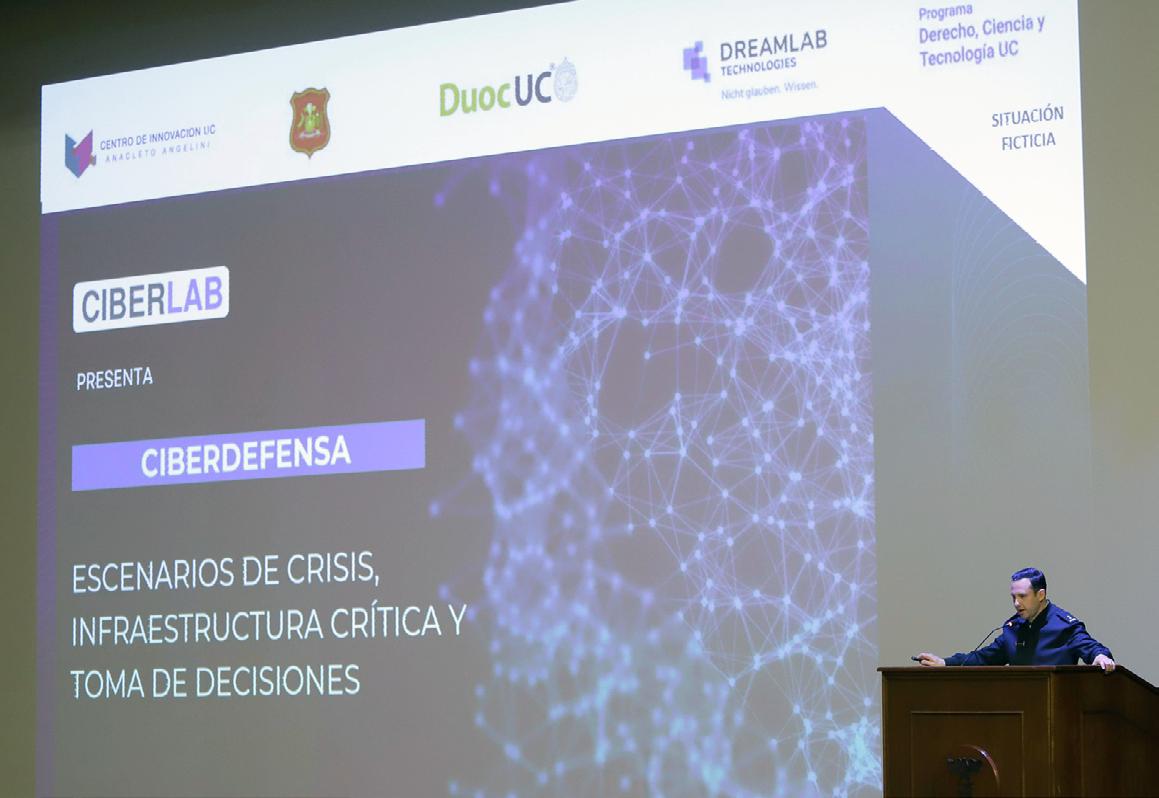 El expositor se sumó posteriormente al panel “Desafíos de la Ciberguerra e Infraestructuras Críticas”, integrado por representantes del Ejército de Chile, del Coordinador Eléctrico Nacional, y del Programa Derecho, Ciencia y Tecnología UC.