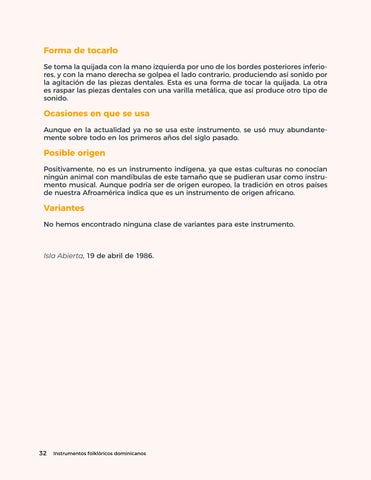 Cada artículo describe un sonajero especialmente particular de la organología dominicana, y desde una introducción sobre el instrumento, pasando por formas de ejecución, fabricación, contextos, mapa geográfico, materiales, sonidos, procedencia de los mismos, en breve texto, nos sitúa en cada uno de los más de 28 instrumentos o formas sonoras descritas.