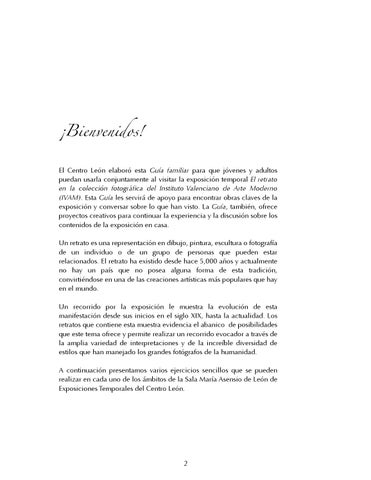 ¡Bienvenidos! El Centro León elaboró esta Guía familiar para que jóvenes y adultos puedan usarla conjuntamente al visitar la exposición temporal El retrato en la colección fotográfica del Instituto Valenciano de Arte Moderno (IVAM). Esta Guía les servirá de apoyo para encontrar obras claves de la exposición y conversar sobre lo que han visto. La Guía, también, ofrece proyectos creativos para continuar la experiencia y la discusión sobre los contenidos de la exposición en casa. Un retrato es una representación en dibujo, pintura, escultura o fotografía de un individuo o de un grupo de personas que pueden estar relacionados. El retrato ha existido desde hace 5,000 años y actualmente no hay un país que no posea alguna forma de esta tradición, convirtiéndose en una de las creaciones artísticas más populares que hay en el mundo. Un recorrido por la exposición le muestra la evolución de esta manifestación desde sus inicios en el siglo XIX, hasta la actualidad. Los retratos que contiene esta muestra evidencia el abanico de posibilidades que este tema ofrece y permite realizar un recorrido evocador a través de la amplia variedad de interpretaciones y de la increíble diversidad de estilos que han manejado los grandes fotógrafos de la humanidad. A continuación presentamos varios ejercicios sencillos que se pueden realizar en cada uno de los ámbitos de la Sala María Asensio de León de Exposiciones Temporales del Centro León.
