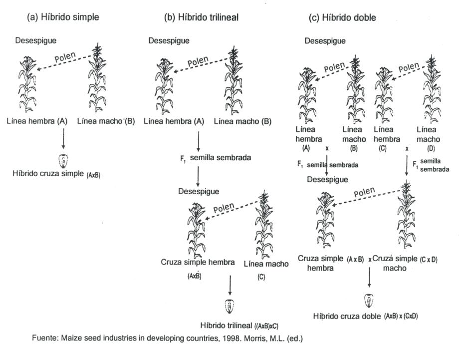 En nuestro país, un ejemplo de híbridos trilineales es H-59, y en el pasado H-53; mientras H-3 y H-5 fueron los primeros híbridos en el área centroamericana, los cuales eran híbridos dobles. En la siguiente figura se muestra cómo se forman los diversos híbridos convencionales.